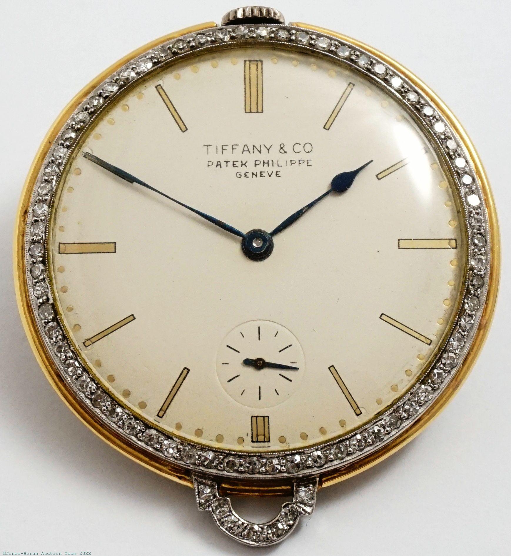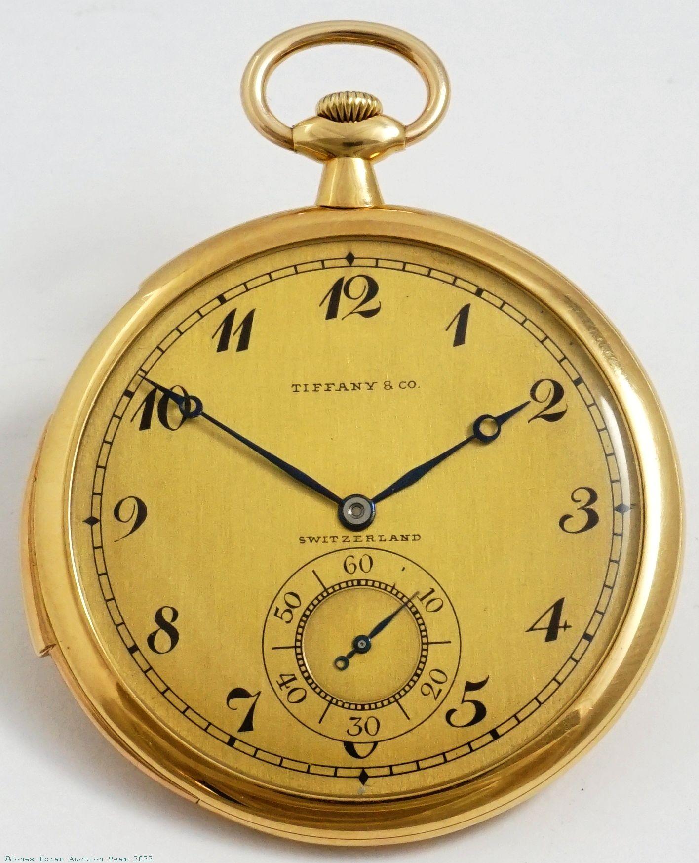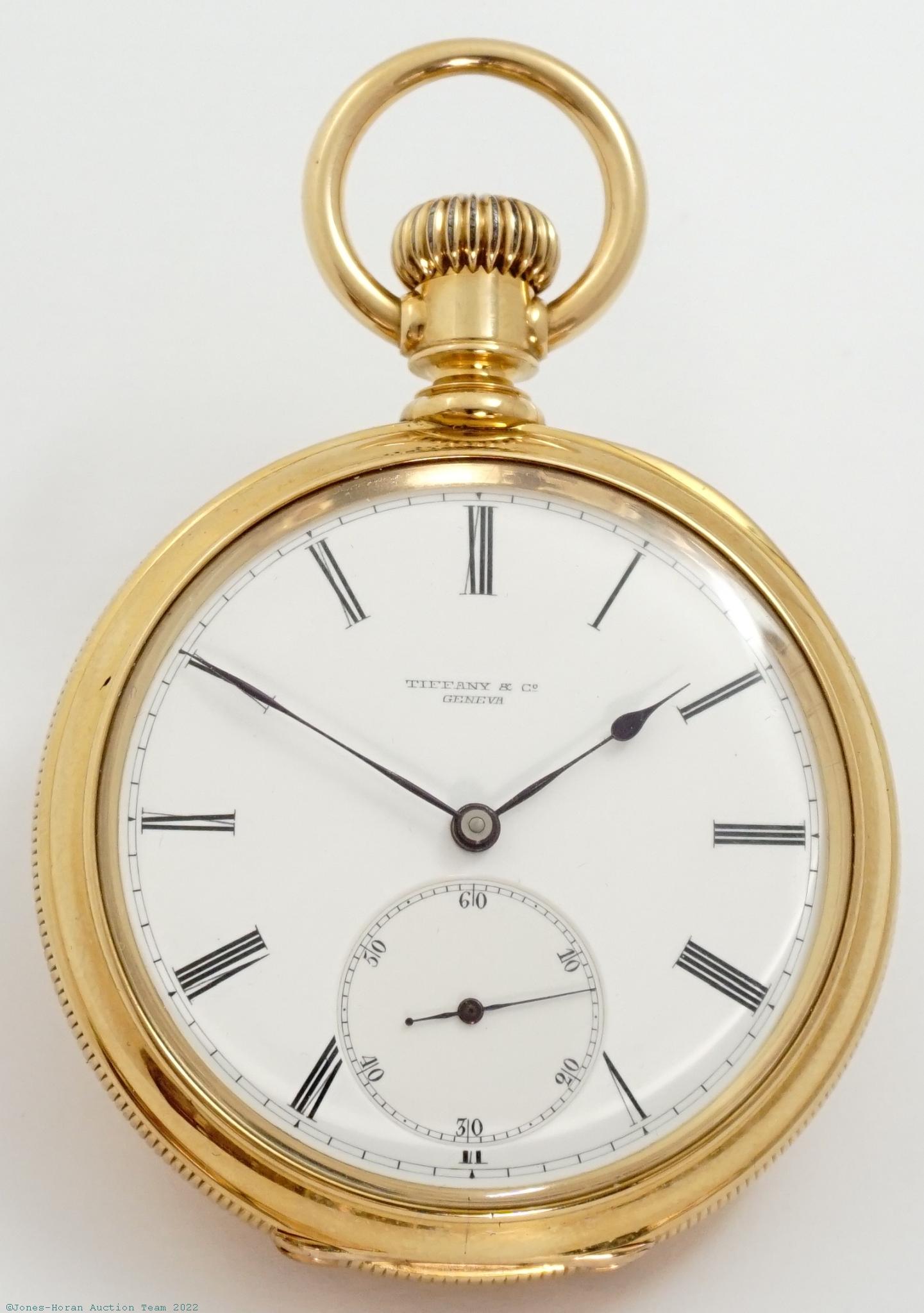 EPW - Tiffany & Co, New York, Swiss made, 50mm, 18K gold OF original Tiffany & Co case with small Jurgensen-style lips, gold cuvette, white enamel SS dial, SW-SS, fully capped lever escapement with counterpoise, 20-21J, fausses-côtes pattern nickel damascene, s#62290. Gross weight of assembled watch 67.9 dwt (105.7 g).