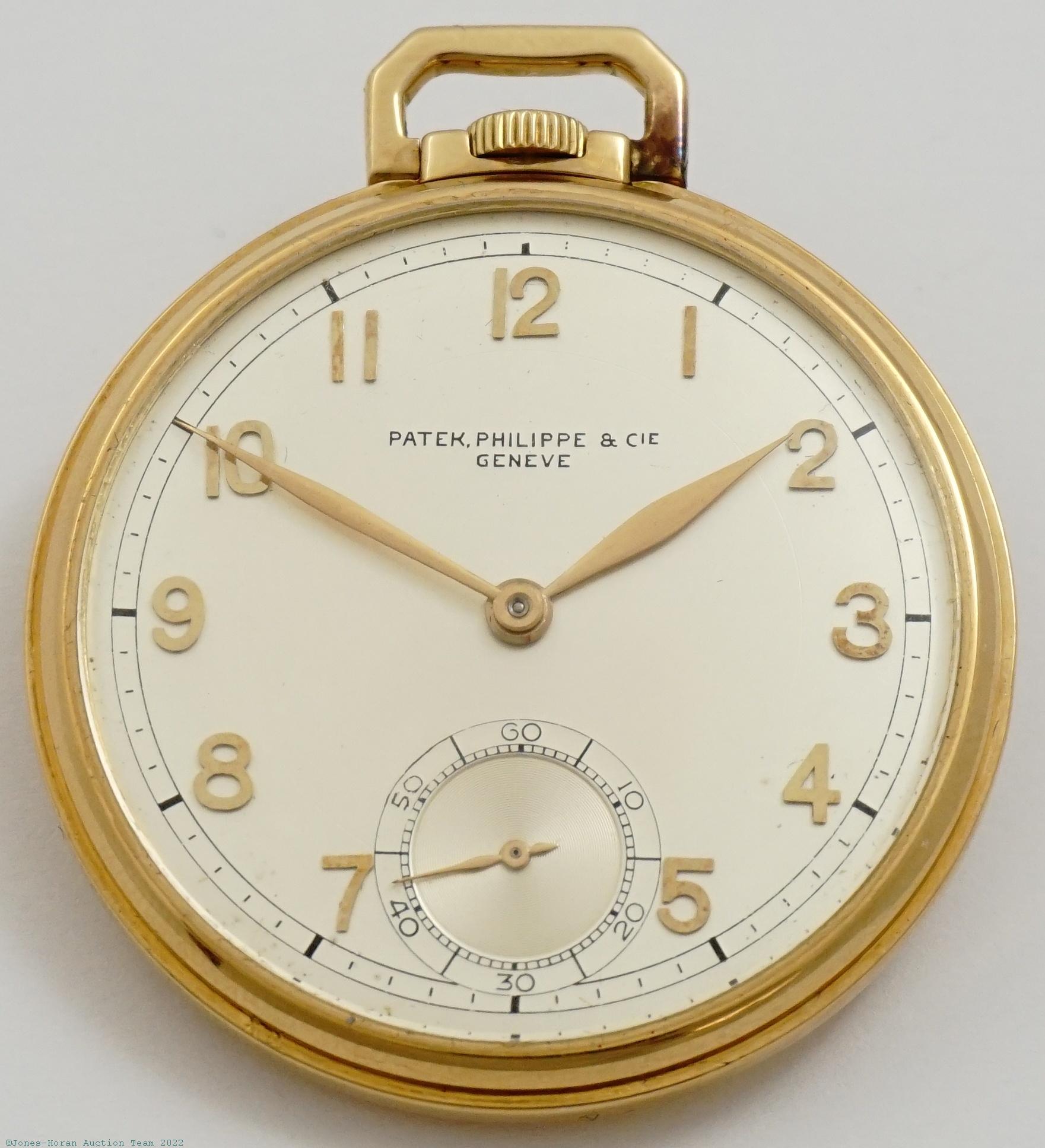 EPW - Patek Philippe, Genève, 53mm, heavy 18K gold original PP.Co HC, signed gold cuvette, white enamel SS dial, gold hands, SW-SS, lever escapement with moustache counterpoise, 15J, wolf's tooth winding, gilt mvt, s#164594 with matching serial number to cuvette. Gross weight of assembled watch 80.9 dwt (125.8 g).