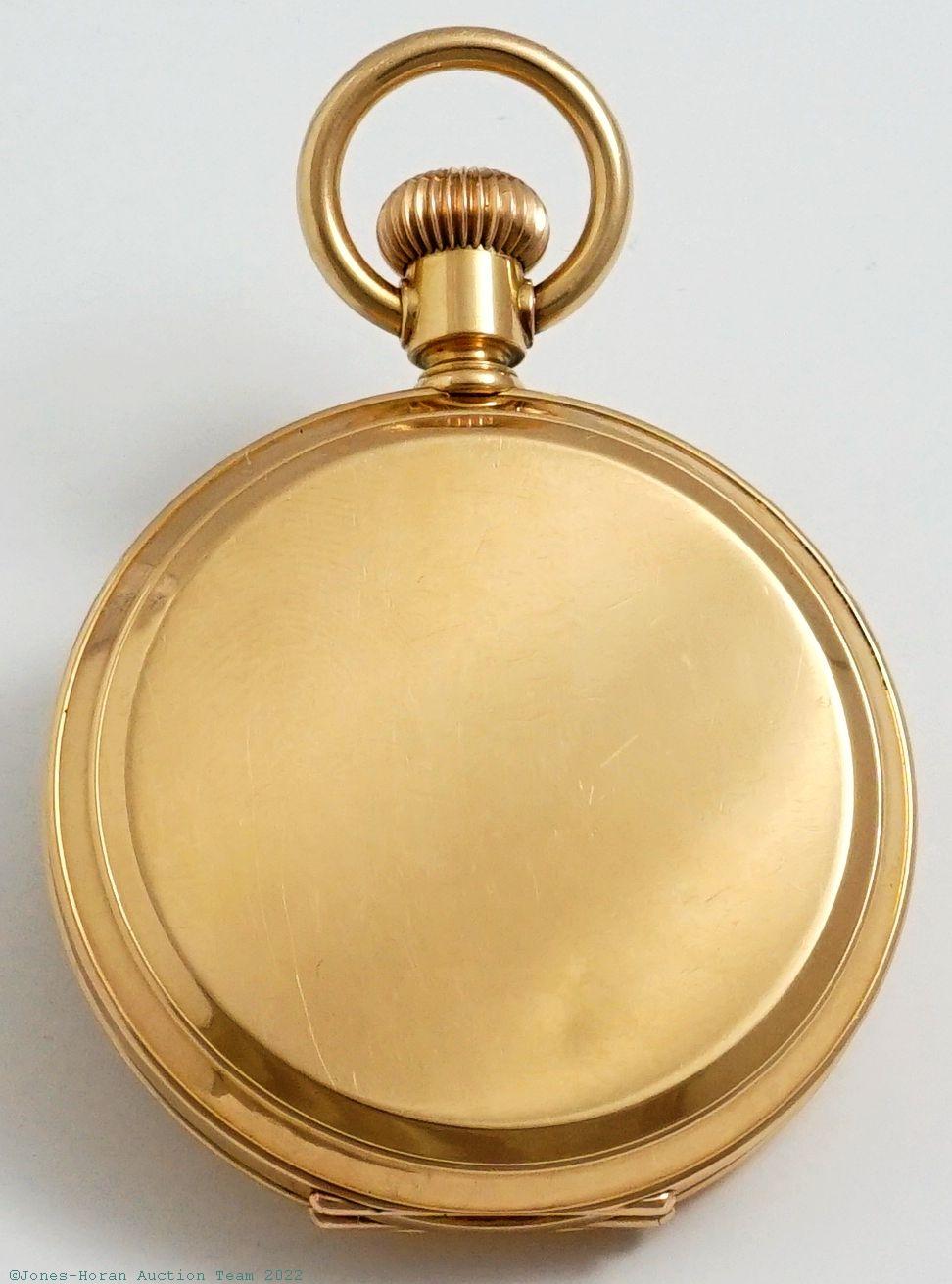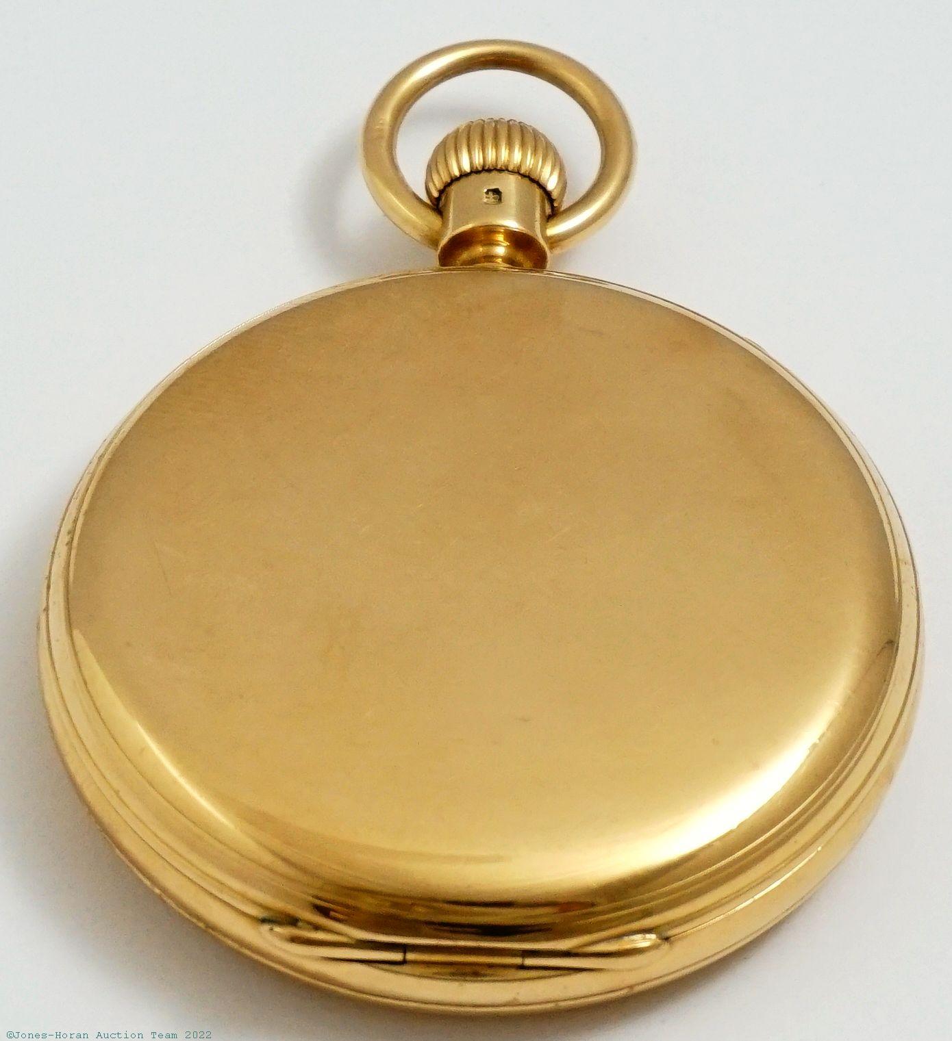 EPW - Dent, London, keyless lever, 48mm, 18K gold original demi-HC bearing London hallmarks for 1901, "J W" in oval cameo for casemaker Joseph Walton & Co, rear with seated dog above crest marked "Militat In Sylvis," white enamel SS dial, SW-pin-set, fully capped lever escapement, 19J, gilt mvt, s#52910. Gross weight of assembled watch 57.0 dwt (88.6 g).