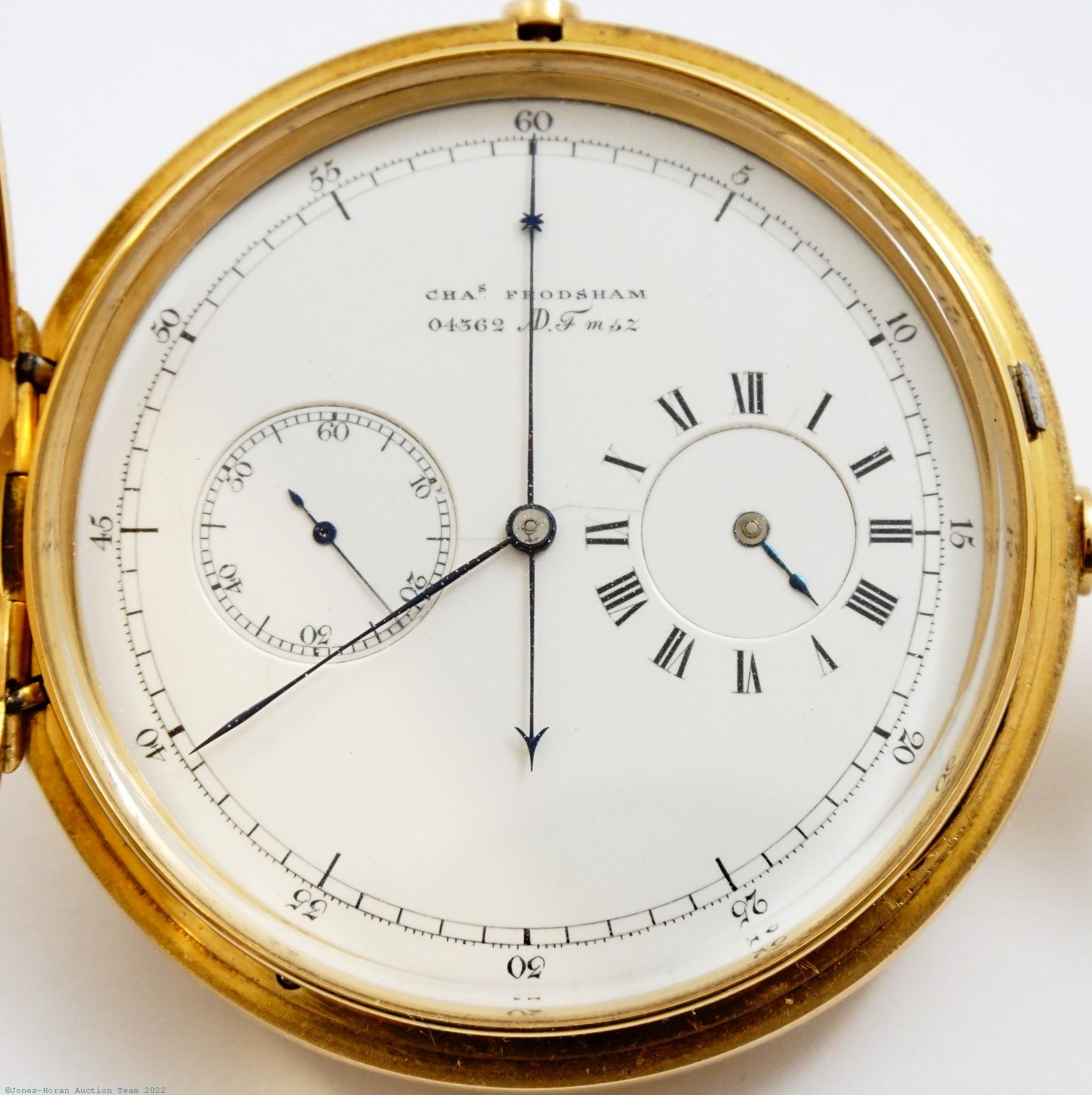 EPW - Charles Frodsham, 84 Strand, London, chronograph keyless lever with regulator style dial, 54mm, very heavy 18K gold original HC bearing London hallmarks for 1870, "A N" marking in oval cameo for casemaker Adolph Nicole, ornate monogram initials to front, gold cuvette, white enamel DS dial, SW-pin-set with Nicole Nielsen keyless winding system, fully capped lever escapement, at least 19J, gilt mvt, s#04362. Gross weight of assembled watch 113.3 dwt (176.2 g).