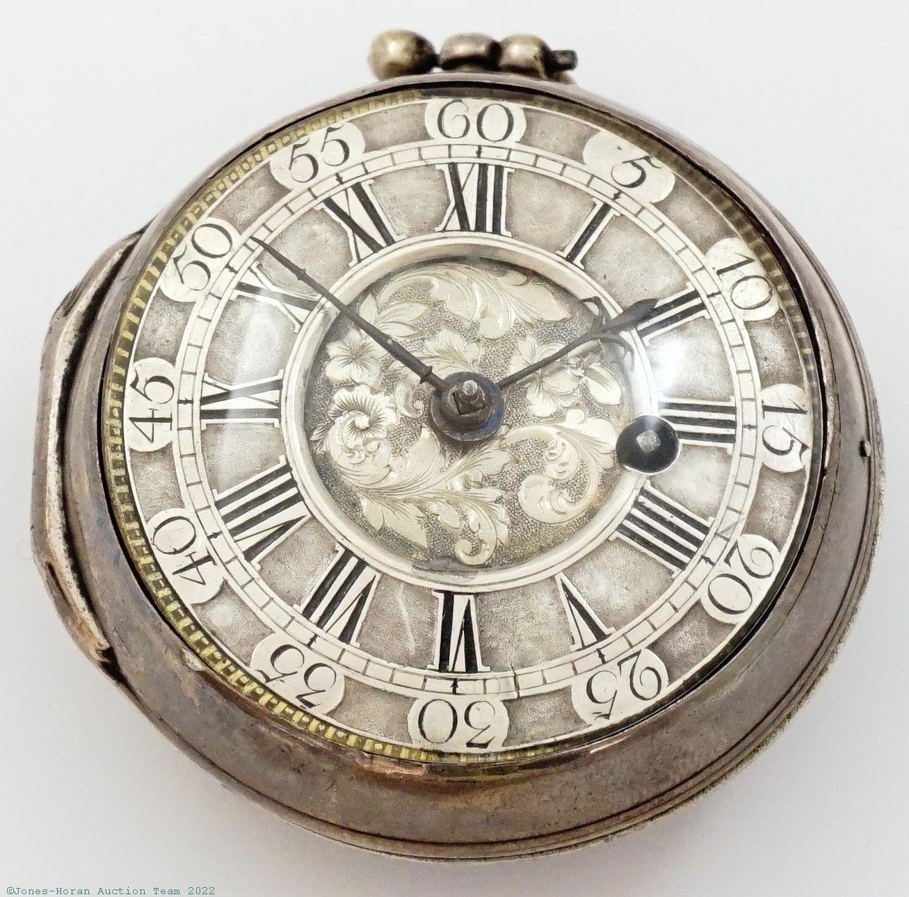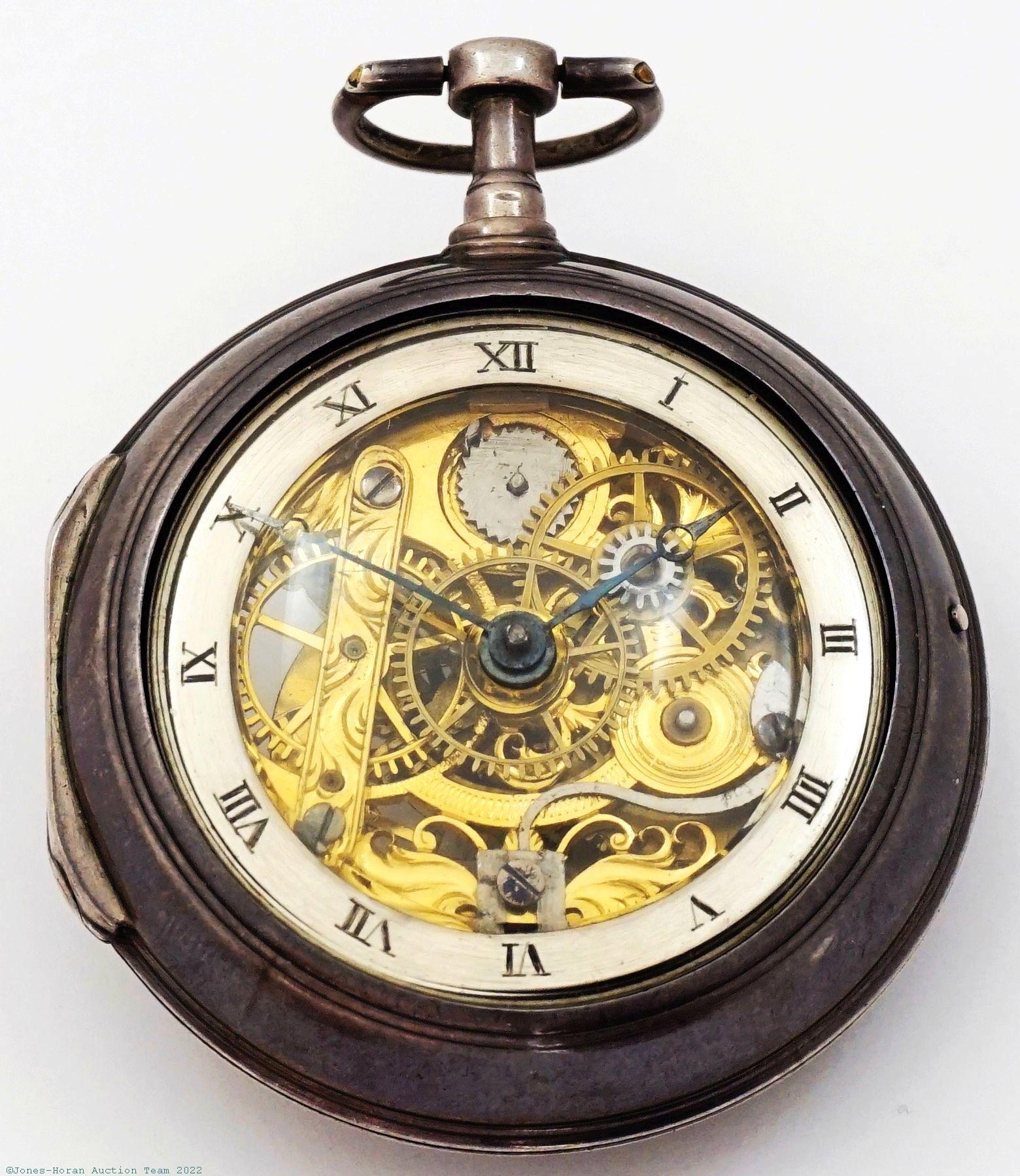 EPW - Upjohn, London, skeletonized verge fusee, 51mm, silver OF pair display cases, silver perimeter dial chapter, KWKS, verge escapement, skeletonized gilt mvt with signed two-footed balance bridge, floral engraved pillar plate, s#196. A very attractive piece with an elegant execution to its skeletonization.