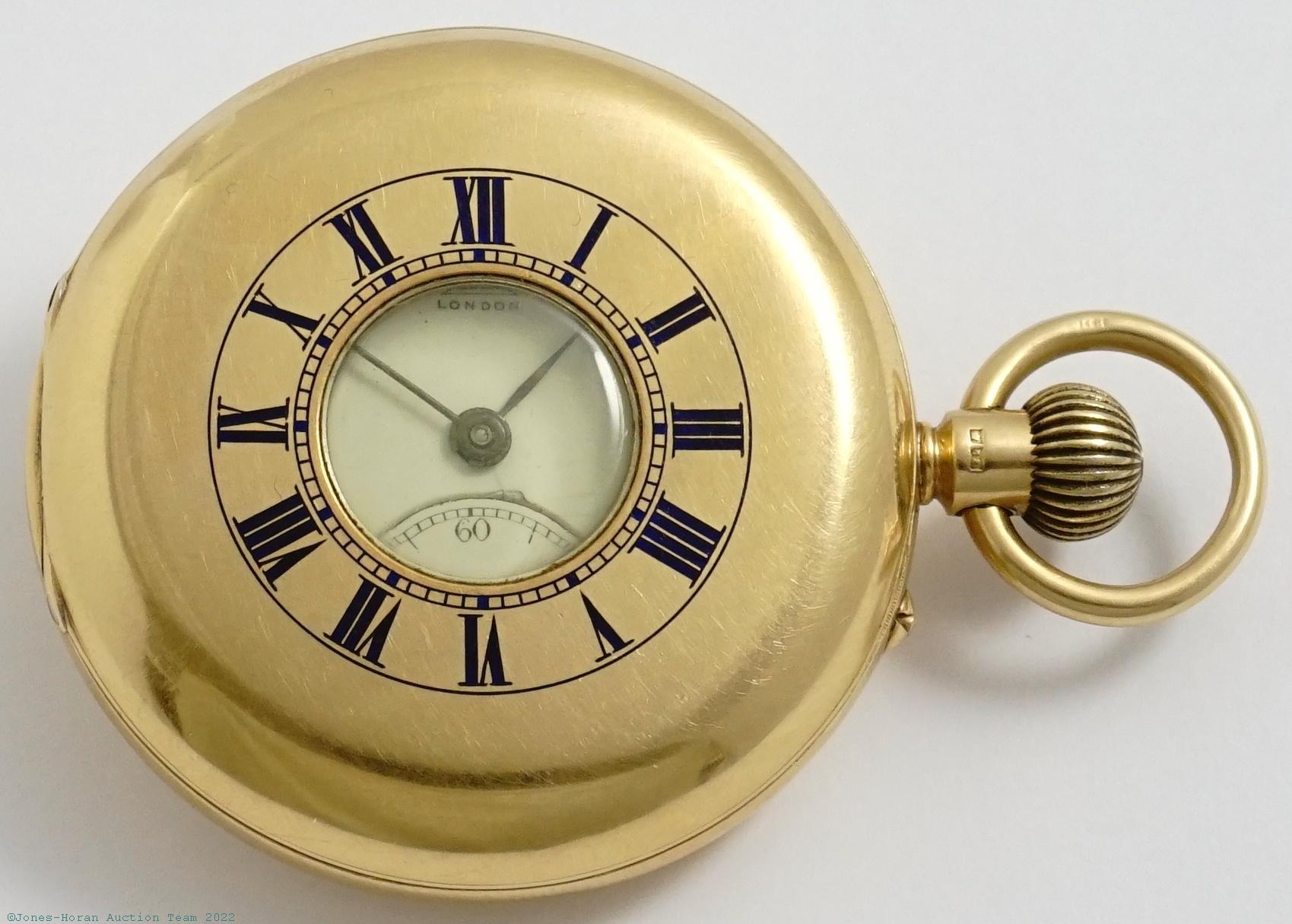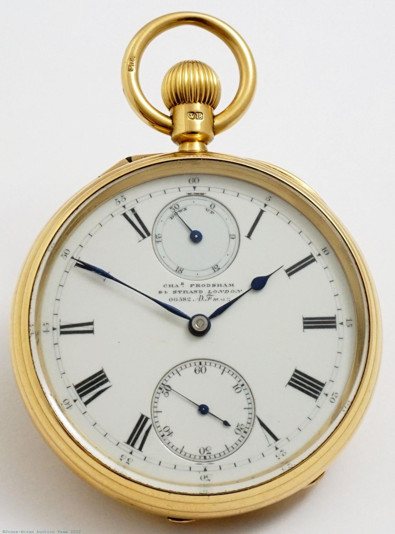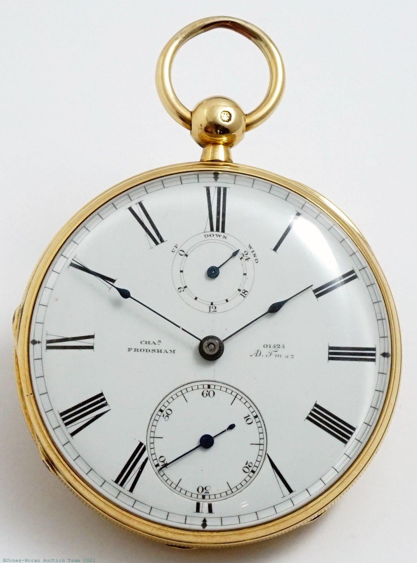 EPW - Charles Frodsham, 84 Strand, London, pocket chronometer with spring detent escapement, helical hairspring, and 24-hour winding indicator, 48mm, 18K gold OF original case bearing London hallmarks for 1862, "R R" marking in oval cameo for casemaker Robert Rowlands, center rear of case with engraving of an armored arm extending through a crown and holding a sword, white enamel SS dial, fully capped spring detent escapement, possibly 17J, free-sprung balance with helical hairspring and diamond endstone, gilt mvt, s#01525 with matching serial number to dial. Gross weight of assembled watch 67.9 dwt (105.6 g).