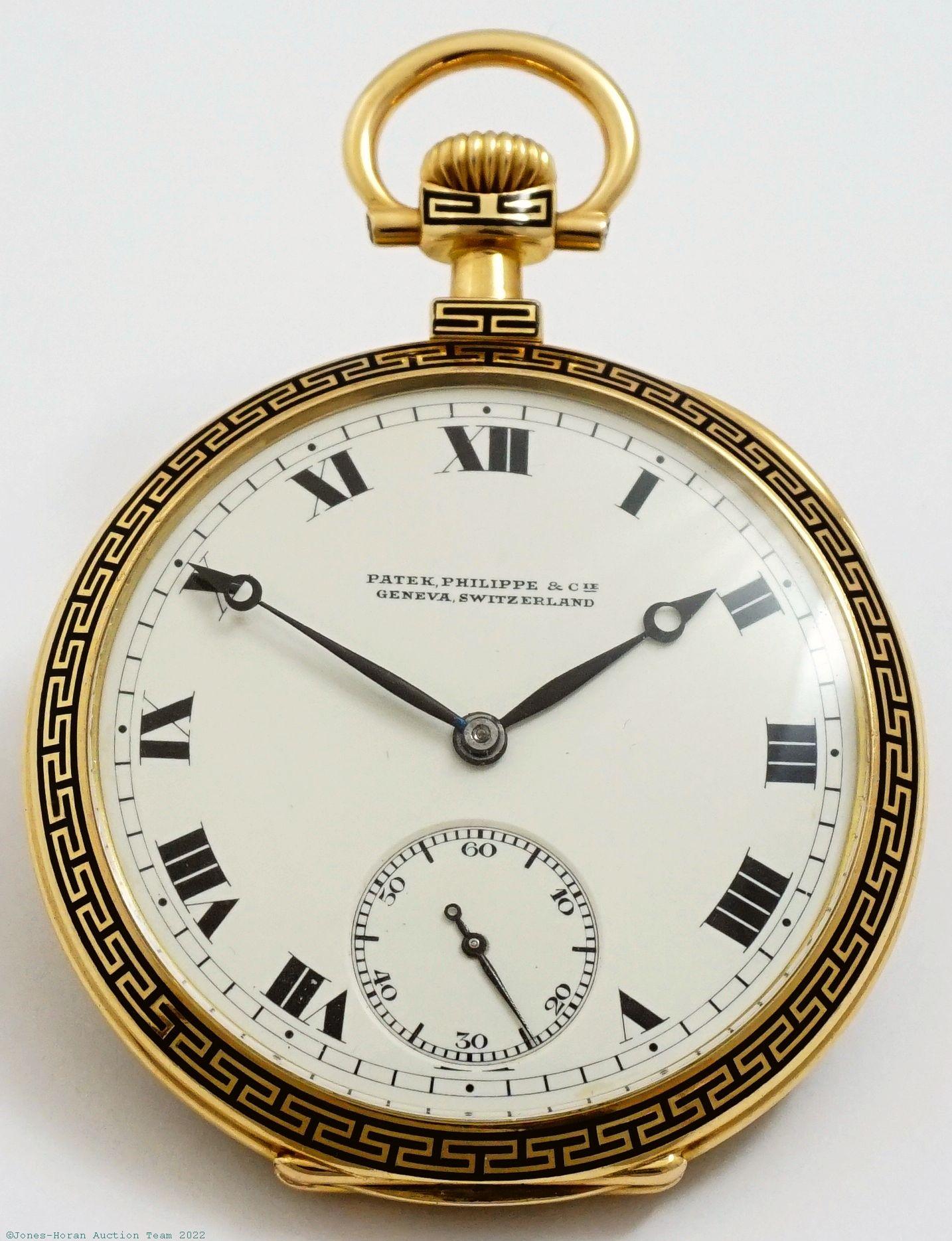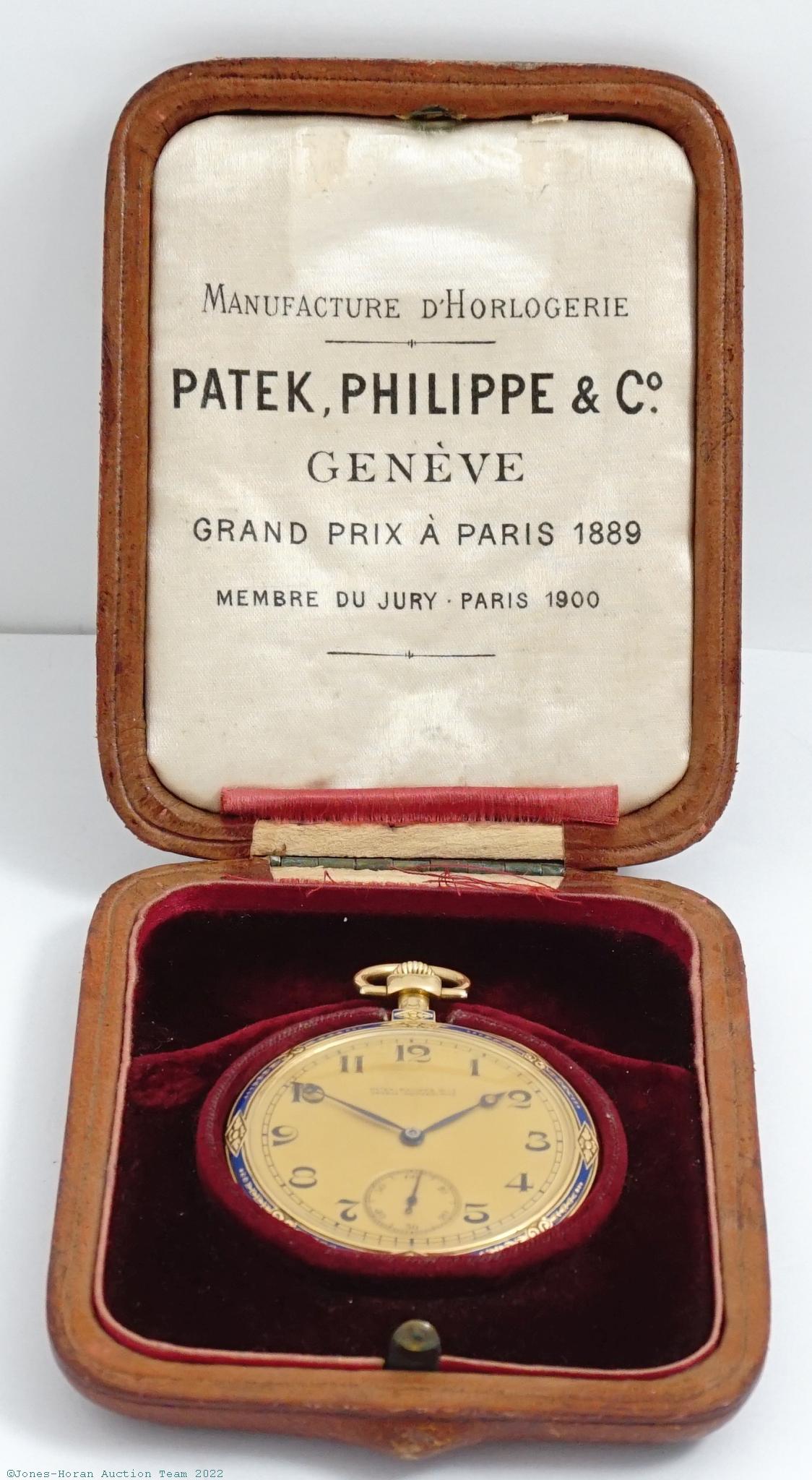 EPW - Patek Philippe, Genève, mvt and case signed for retailer A. & C. Feldenheimer of Portland, Oregon, 46mm, 18K gold OF original PP.Co case with elegant royal blue enamel inlay to bezel, rear perimeter, and base of pendant at front and rear, initials to rear, signed gold cuvette with engraved 1919 presentation, gilt dial, SW-SS, lever escapement with capped escape wheel and counterpoise, 18J, wolf's tooth winding, fausses-côtes pattern nickel damascene, s#190000 with matching serial number to cuvette signature ring. Comes with a fitted leather Patek Philippe & Co. box. Gross weight of assembled watch 41.4 dwt (64.4 g).