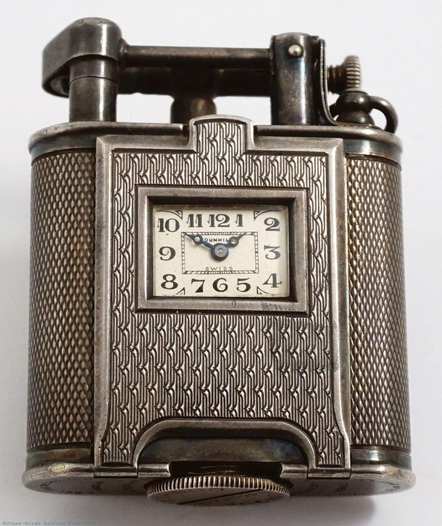 EPW - Dunhill, Swiss, silver lighter with watch, 37mm x 46mm, sterling silver OF original cigarette lighter case with beautiful engine turning detail, silvered dial, SW-SS, lever escapement, 15J, fausses-côtes pattern nickel damascene, s#218 within case. A beautiful example of this scarce item, with case having crisp engine turning detail and a superb acquired patina. Comes with a box marked to a Peoria, Illinois retailer as pictured.