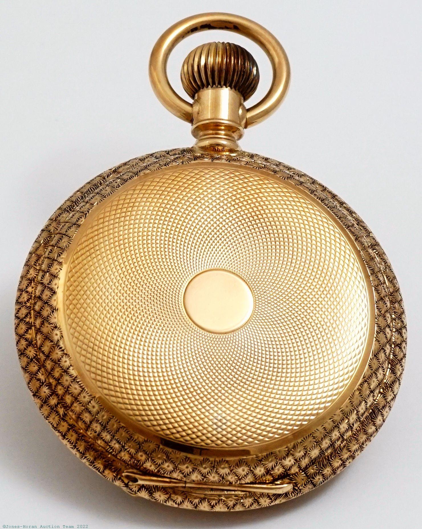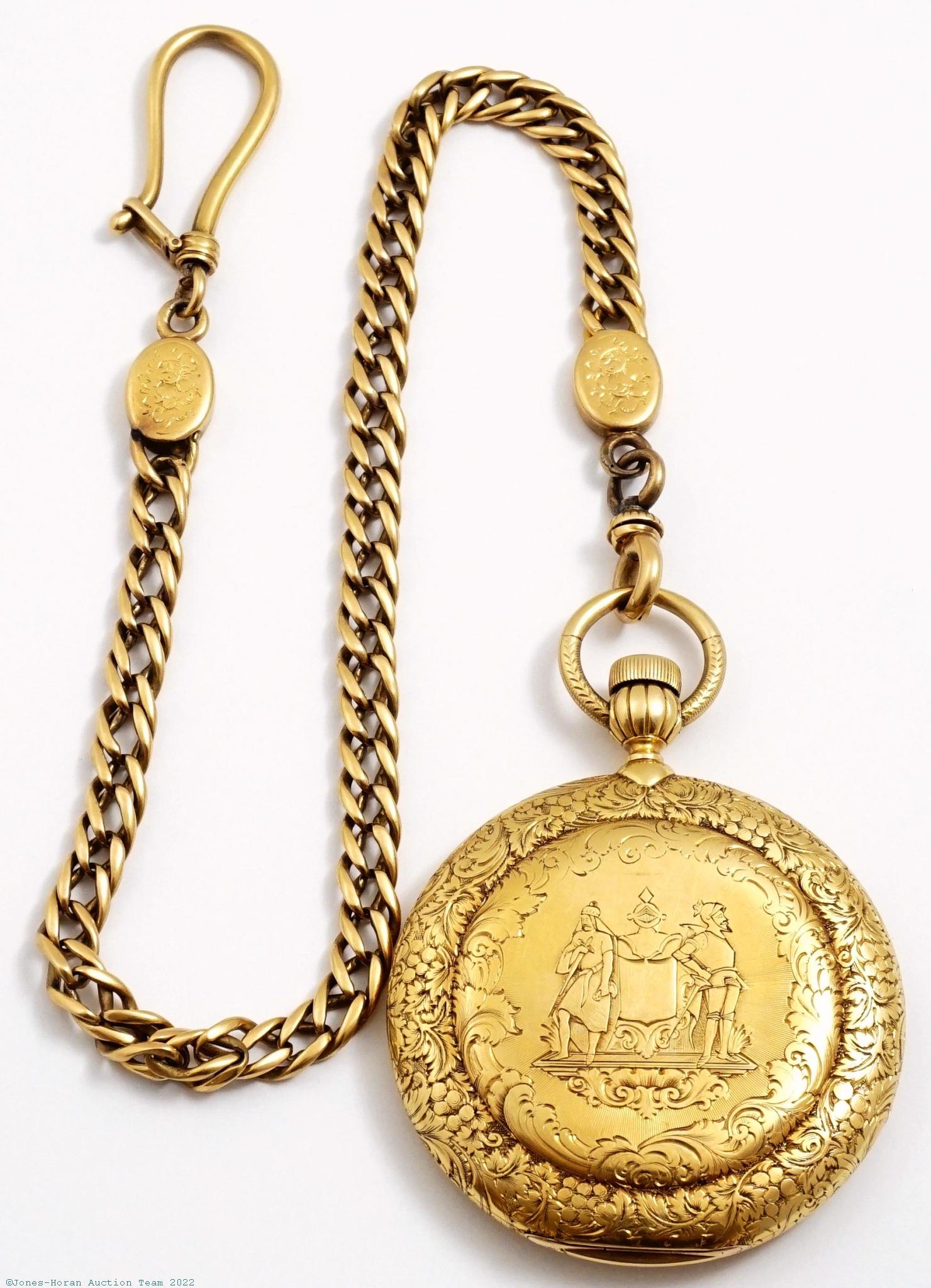 Mvt: Running, good winding indicator function, nearly mint cosmetic mvt condition overall, some light toning and typical mild micro-fine scratches to plates; dial with mild surface toning having some scattered lighter and darker spots; nearly mint hands; case shows hardly any wear, some scattered small dark spots to bezel and rear perimeter that appear to be on surface but do not remove or change appearance with light prodding or with a wipe of acetone, no dents or dings, superb engraving detail; tight bow, crown shows hardly any wear; good glass crystal; box shows little wear, upper portion is closing securely but is not flush along front side due to mild warping from age, underside with a crack running across its length at center; chain is excellent showing hardly any wear.