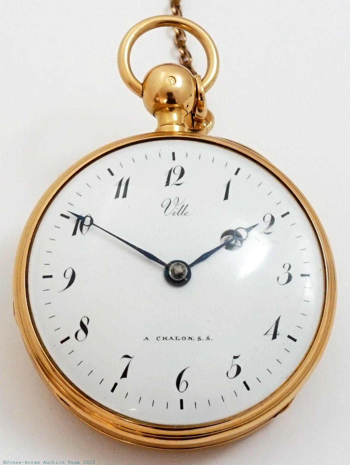 EPW - Ville a Chalons S.S., fusee quarter-hour repeater, 52mm, 18K gold (tested) OF original case with slide on band at 10:30 to allow/prevent repeat activation via plunge of pendant, signed spring-loaded gilt cuvette, white enamel dial with winding aperture at 2, KWKS, likely a verge escapement though not disassembled to confirm, gilt mvt with pierced and foliate scrolled two-footed balance bridge, s#12011 and s#49389 within case. Comes as pictured with a short gold-filled chain with replacement 14K gold swivel and with a modern key. Gross weight of assembled watch 79.8 dwt (124.2 g).