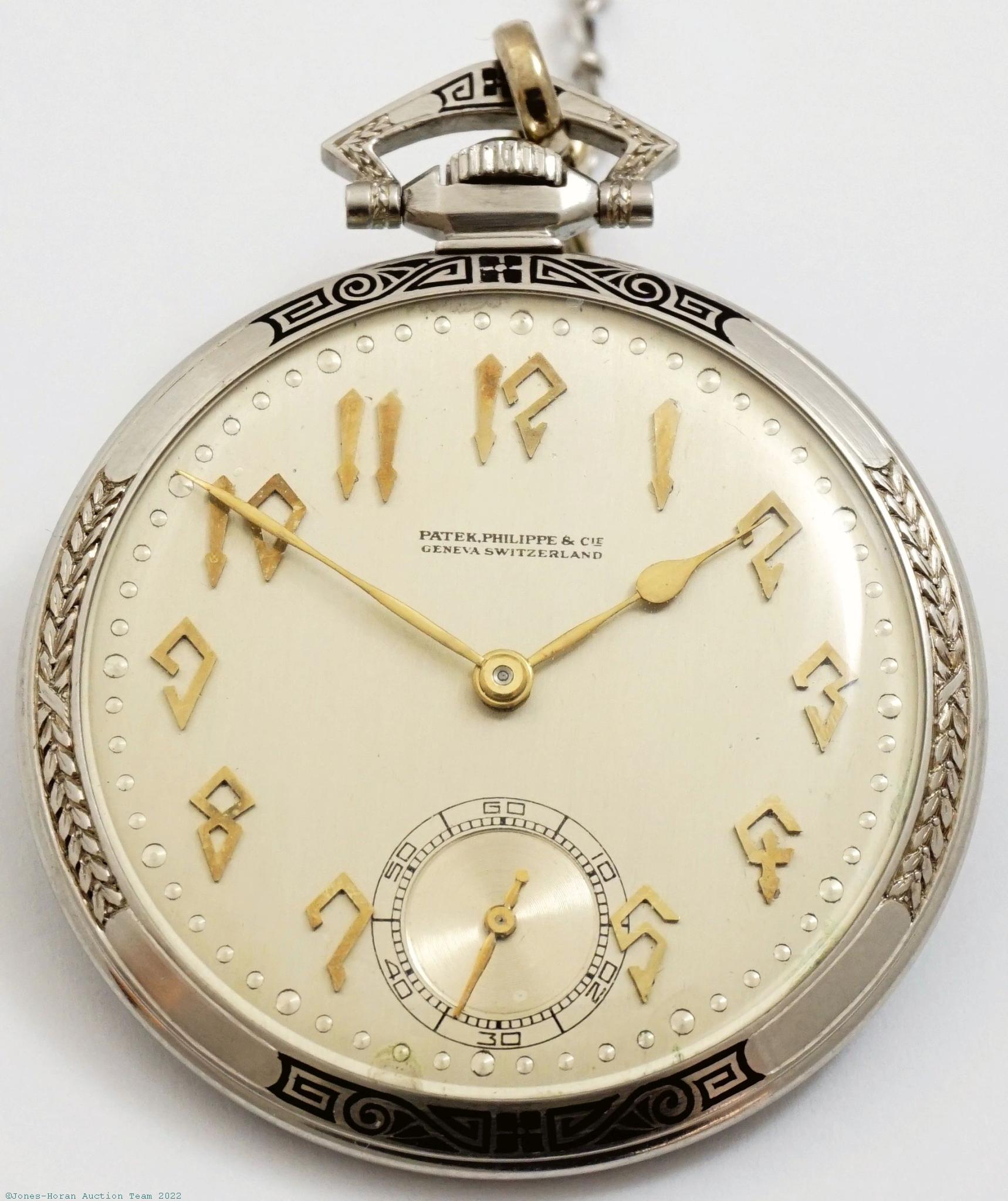 EPW - Patek Philippe, Genève, mvt marked for retailer Spaulding & Co. of Chicago, IL, 44mm, platinum and iridium OF case with black enameling to bezel, bow and rear perimeter, refinished silvered dial with applied gold numerals in stylish Arabic design, SW-SS, lever escapement with counterpoise and capped escape wheel, 18J, fausses-côtes pattern nickel damascene, s#173617. Comes as pictured with a 14 inch platinum and black enameled chain having replacement 14K white gold swivels, and watch also comes as pictured with a Patek Philippe marked leather pouch. Gross weight of assembled watch 33.8 dwt (52.6 g). Gross weight of chain 7.7 dwt (11.9 g).