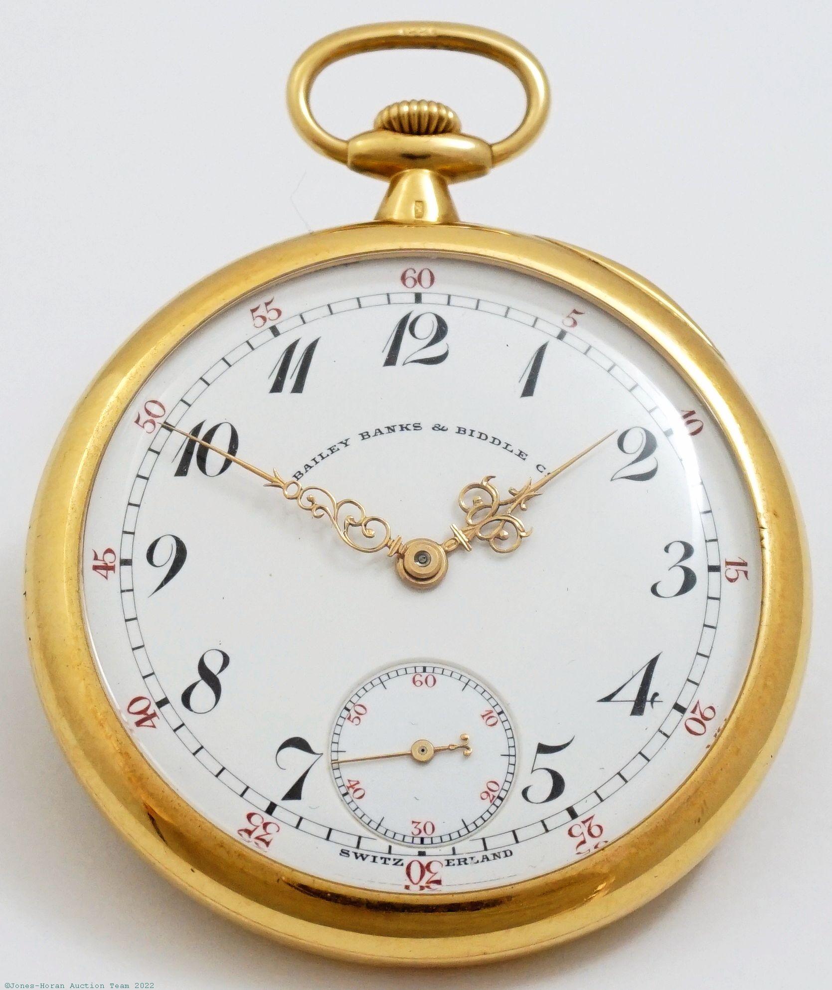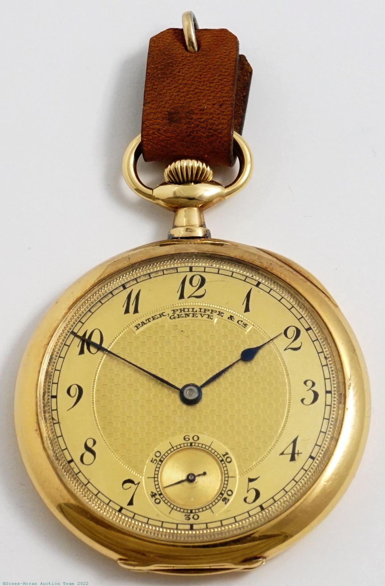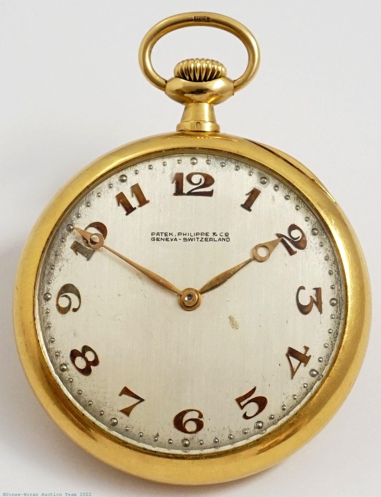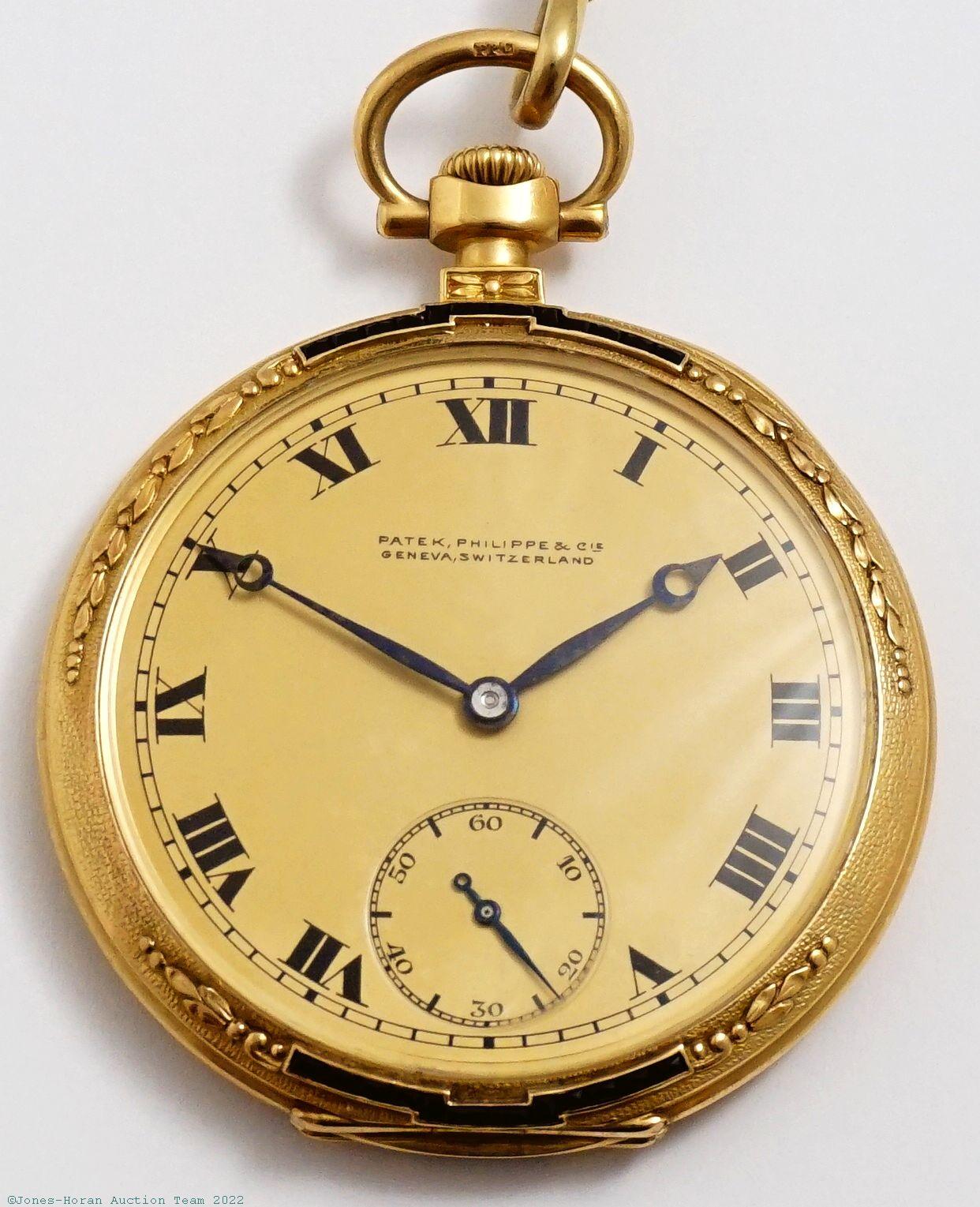 EPW - Patek Philippe, Genève, mvt and case marked for retailer Spaulding & Co. of Chicago, 46mm, 18K gold OF original PP.Co case with elegant bezel and rear perimeter having faceted onyx inset at upper and lower portions, rear with initials, gold cuvette with signature ring for Patek Philippe and retailer, cuvette also with 1922 presentation engraving, metal dial, SW-SS, lever escapement with counterpoise and capped escape wheel, wolf's tooth winding, fausses-côtes pattern nickel damascene, s#199597. Comes as pictured with a 14 inch 14K gold chain. Gross weight of assembled watch 43.0 dwt (67.0 g). Gross weight of chain 7.9 dwt (12.3 g).