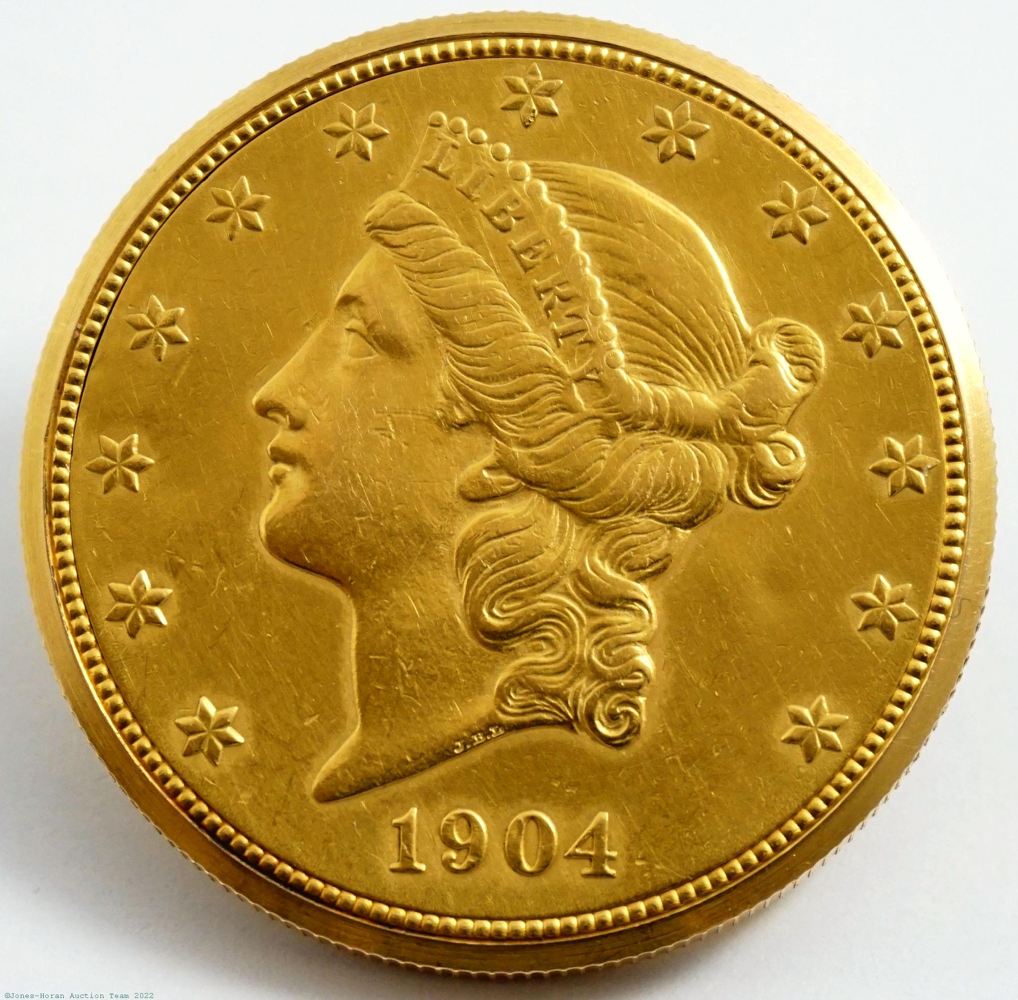 EPW - Vacheron & Constantin, Genève, $20 gold coin watch made from United States Liberty Head 1904-S Double Eagle, 34mm, 90% gold coin containing 18K gold original Vacheron & Constantin case, case front opens via hidden button within coin rim, champagne colored metal dial, SW-SS, lever escapement, 17J cal. 1003 mvt, fausses-côtes pattern nickel damascene, s#559163. Gross weight of assembled watch 22.3 dwt (34.6 g). An excellent example of this iconic watch style.