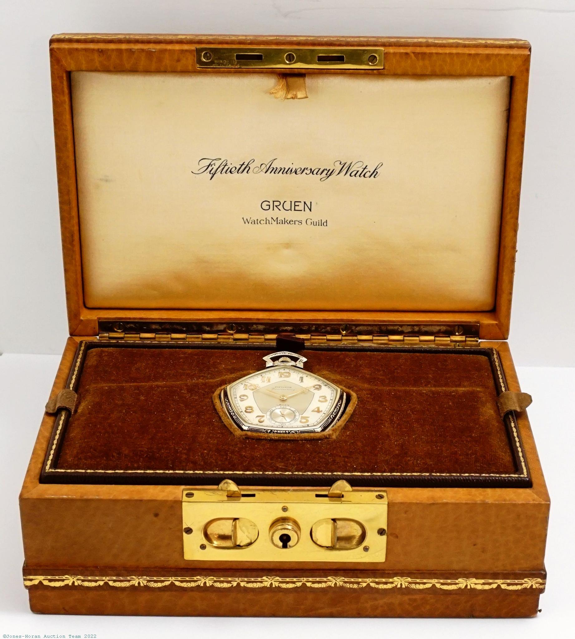 EPW - Gruen, Fiftieth Anniversary Watch, "Twenty-One 21 Jewels & Two 2 Diamonds" marked mvt with gold plates, Swiss made for American market, 12S, 18K white gold pentagonal original Gruen case with black enameling to bezel, rear perimeter and bow, refinished silvered dial with applied gold numerals, SW-SS, fully capped lever escapement, diamond endstones over balance and escape wheel, ornately engraved rose gold mvt plates, s#541. Comes with its original presentation box as pictured. Gross weight of assembled watch 44.6 dwt (69.4 g). The Gruen Fiftieth Anniversary Watch was produced in 1924 and a total of 650 examples were made, this total production figure corresponding to a group of 600 in recognition of each of the months of the 50 years along with a separately numbered series of 50 in recognition of each of the years. These watches were marketed as "The Priceless Possession of a Few" and were catered to a very exclusive clientele, being prohibitively expensive with a base cost of $500 in 1924. For those looking to push past the $500 base cost, there were even higher priced options available depending on case material, finish, and design.