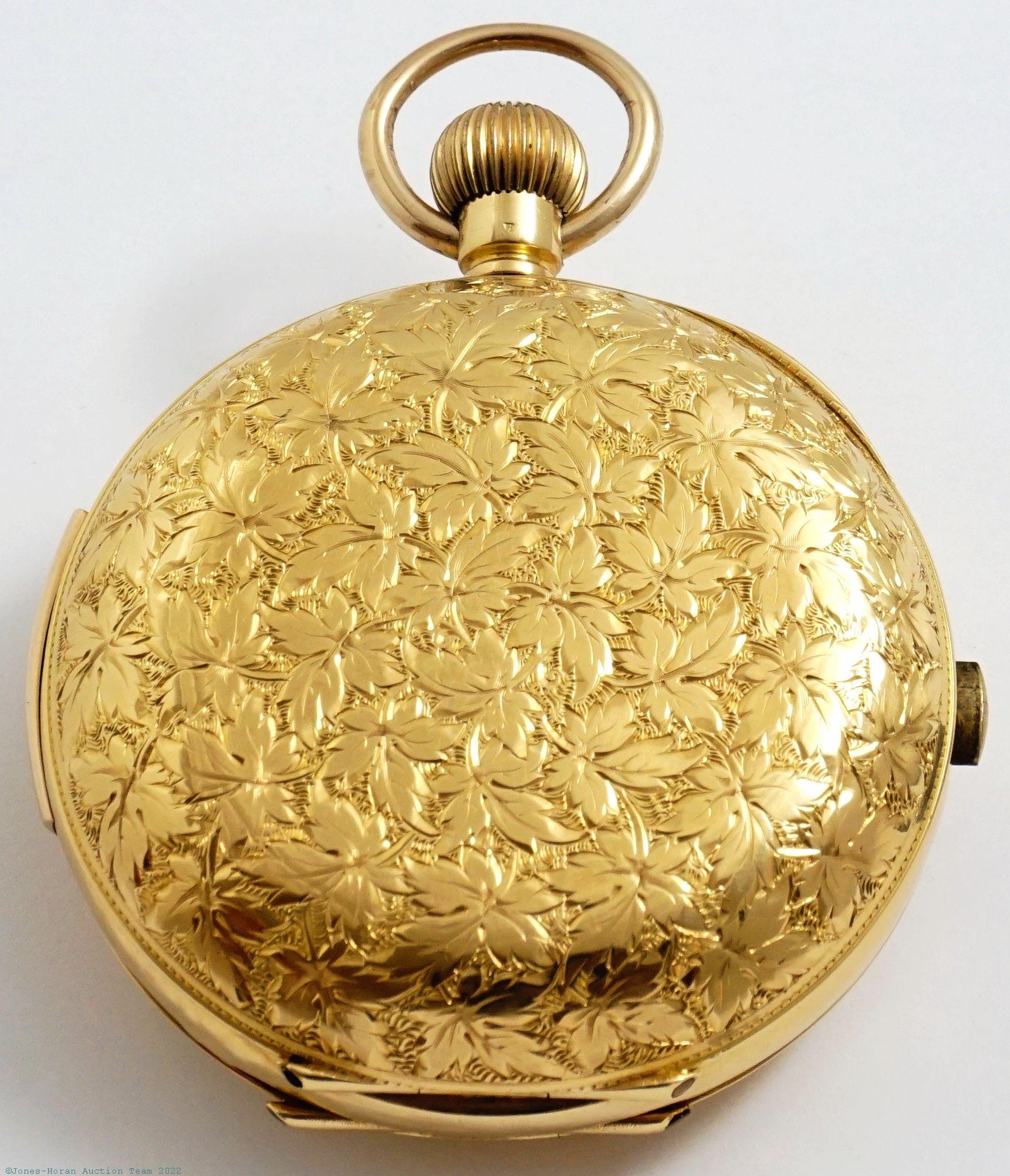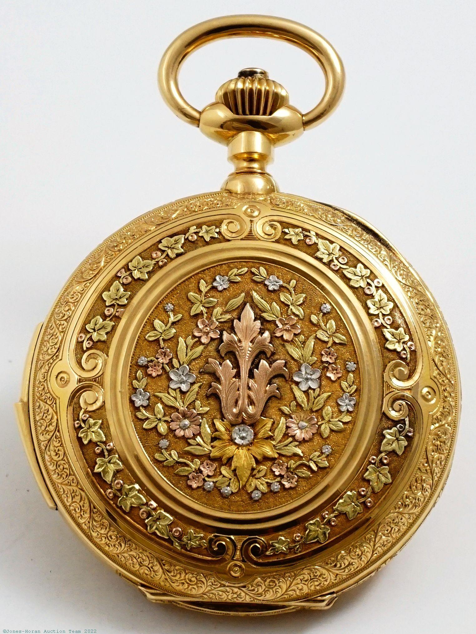 EPW - Unsigned Swiss, quarter-hour repeater with triple calendar and moonphase, 55mm, 18K multicolor gold original HC with exquisite ornate detail, gold cuvette bearing attributes, glazed observation cover over mvt, "Système Breveté" marked white enamel SS dial with Turkish market numerals and calendar markings, gold foil 5-minute indications and gold foil lines separating the calendar and moonphase registers, fancy gilt Louis XV style hands, SW-shift-locking-LS, lever escapement with capped escape wheel and counterpoise, 32J per cuvette marking, nickel damascene, s#30615 within case. Gross weight of assembled watch 88.3 dwt (137.4 g). An absolutely beautiful watch throughout, with an extraordinarily vibrant and crisp multicolor case.