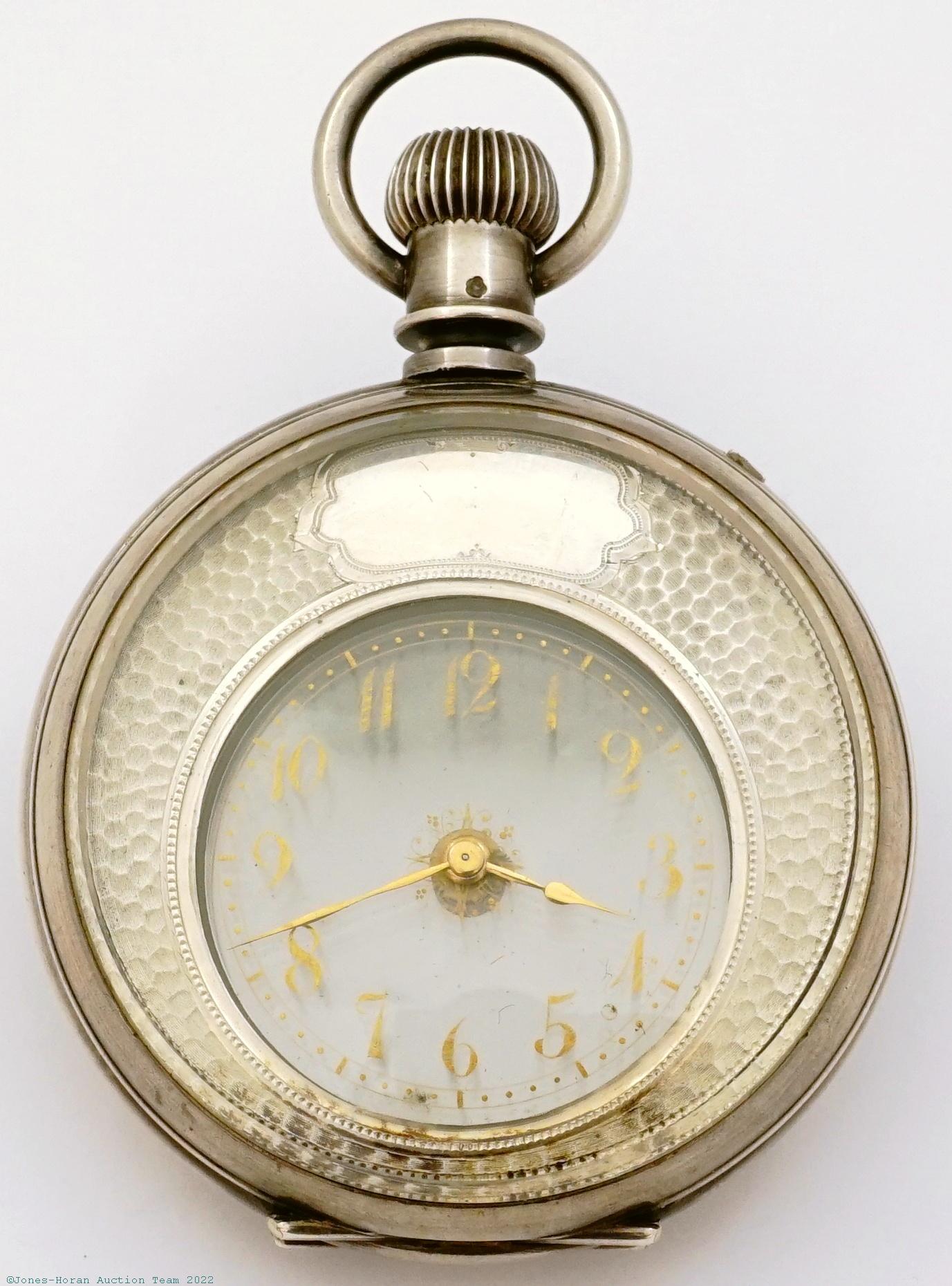 Mvt: NR, fully wound and will tick briefly with a twist, overhaul needed, fine cosmetic mvt condition overall, mvt with play at hinge, missing barrel arbor escutcheon as evidenced by an adjacent tapped hole and a pin hole in main plate, plates with some scattered scratches and fine scratches; dial with hl between center of seconds-register and 3; fine hands, hour and minute of somewhat different color; outer case shows light wear, few small nicks, no dents, button latch good; inner case shows medium wear, dent to edge at 2:30, some dings and nicks to rear, slot for release of mvt latch is notably wider than necessary for the present mvt's latch; bow pivots freely; domed glass bull’s-eye crystal with many scratches and abrasions.