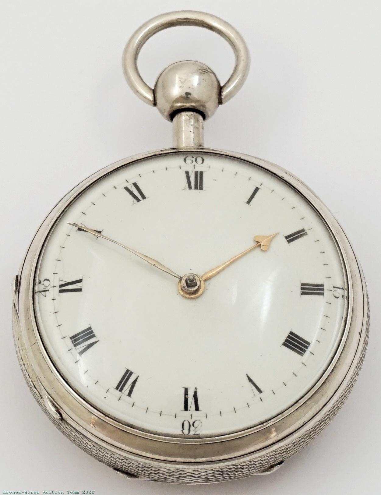 EPW - James Hatton, London, silver fusee pocket chronometer with spring detent escapement and helical hairspring, 57mm, silver OF pair cases bearing London hallmarks for 1831, incuse script "J W" for casemaker John West, outer containing papers for Philadelphia watchmakers John Fries and J. Menzies, cream colored enamel dial, KWKS, capped spring detent escapement, free-sprung balance with helical hairspring, white metal (likely platinum) timing weights, and diamond endstone, balance cock with grotesque mask, gilt mvt, s#356.