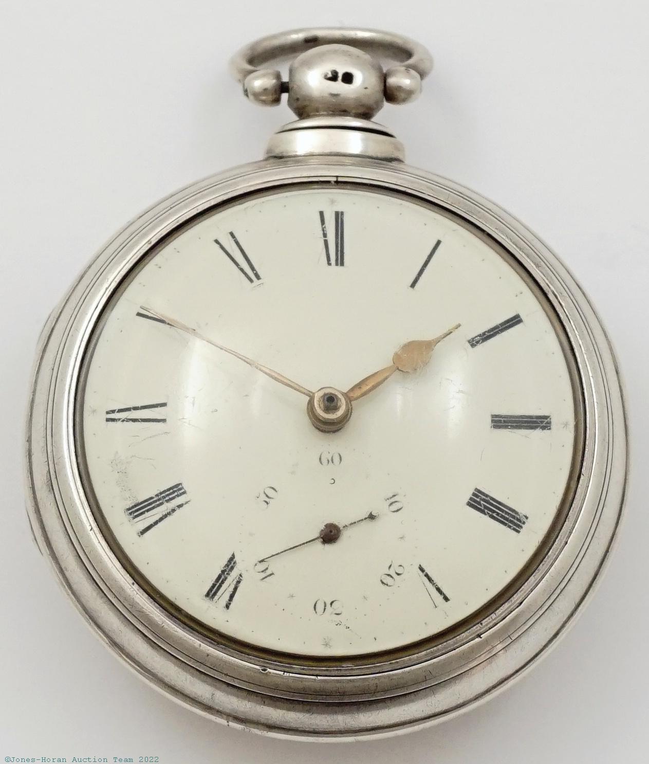 Mvt: NR, chain is detached from fusee and wrapped around barrel with end not visible to determine whether hook is present, balance will tick with reverse pressure held to fusee, overhaul needed, excellent-plus cosmetic mvt condition overall, good gilt tone, few fine scratches; dial with scattered fine scratches, scrape around much of perimeter which takes out portions of some of the 5-minute numerals; fine hands, oxide to tip of minute; outer case shows medium wear, dent at upper-right perimeter of rear, some dings and mild lesser dents scattered elsewhere, upper and lower portions closing with some gap, some dark discoloration to exterior around seat of latch spring, button latch good; inner case shows light wear, some scattered dents and dings, circumferential indentation around perimeter; bow pivots freely; domed glass bull's-eye crystal with few fine scratches.