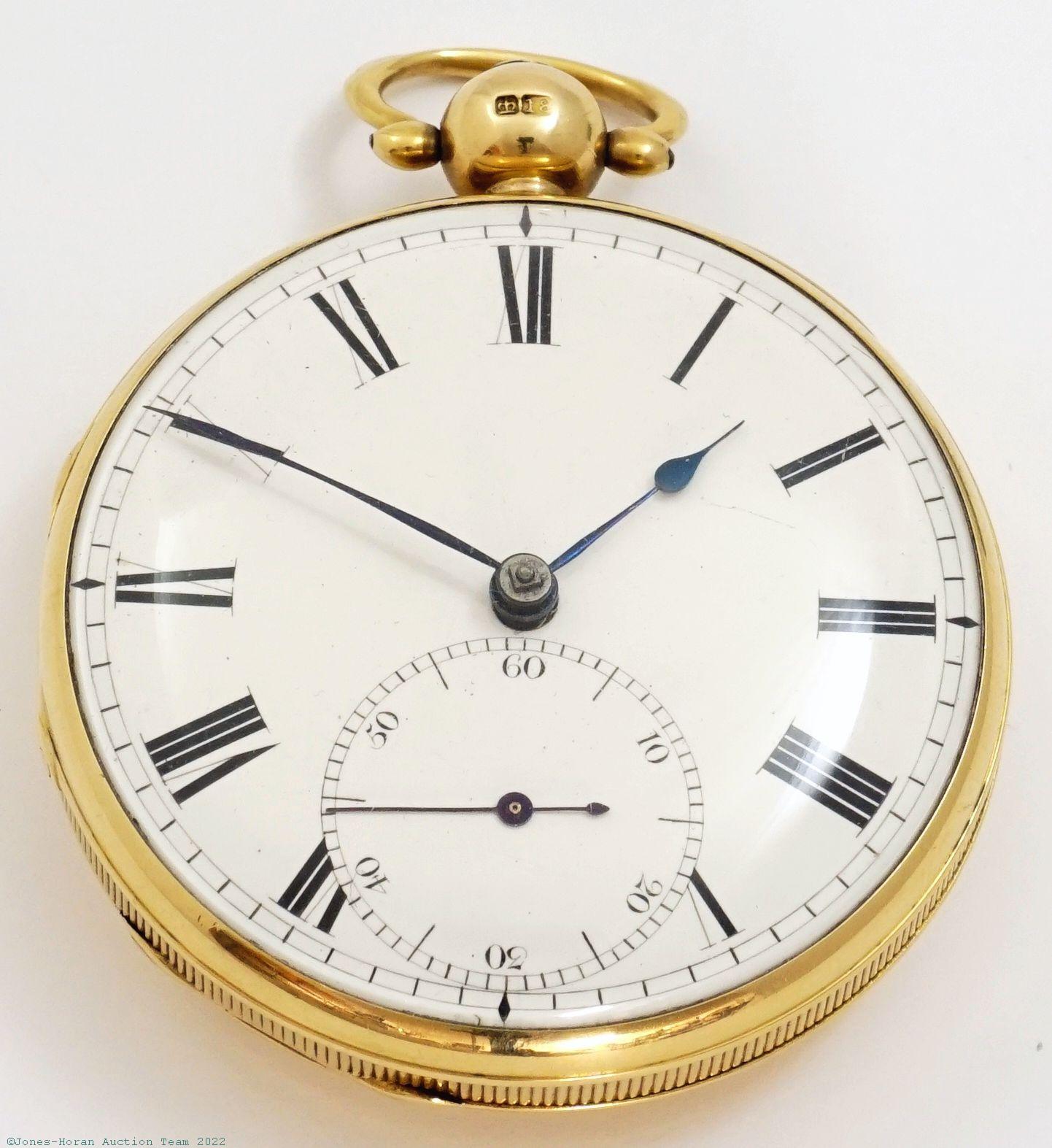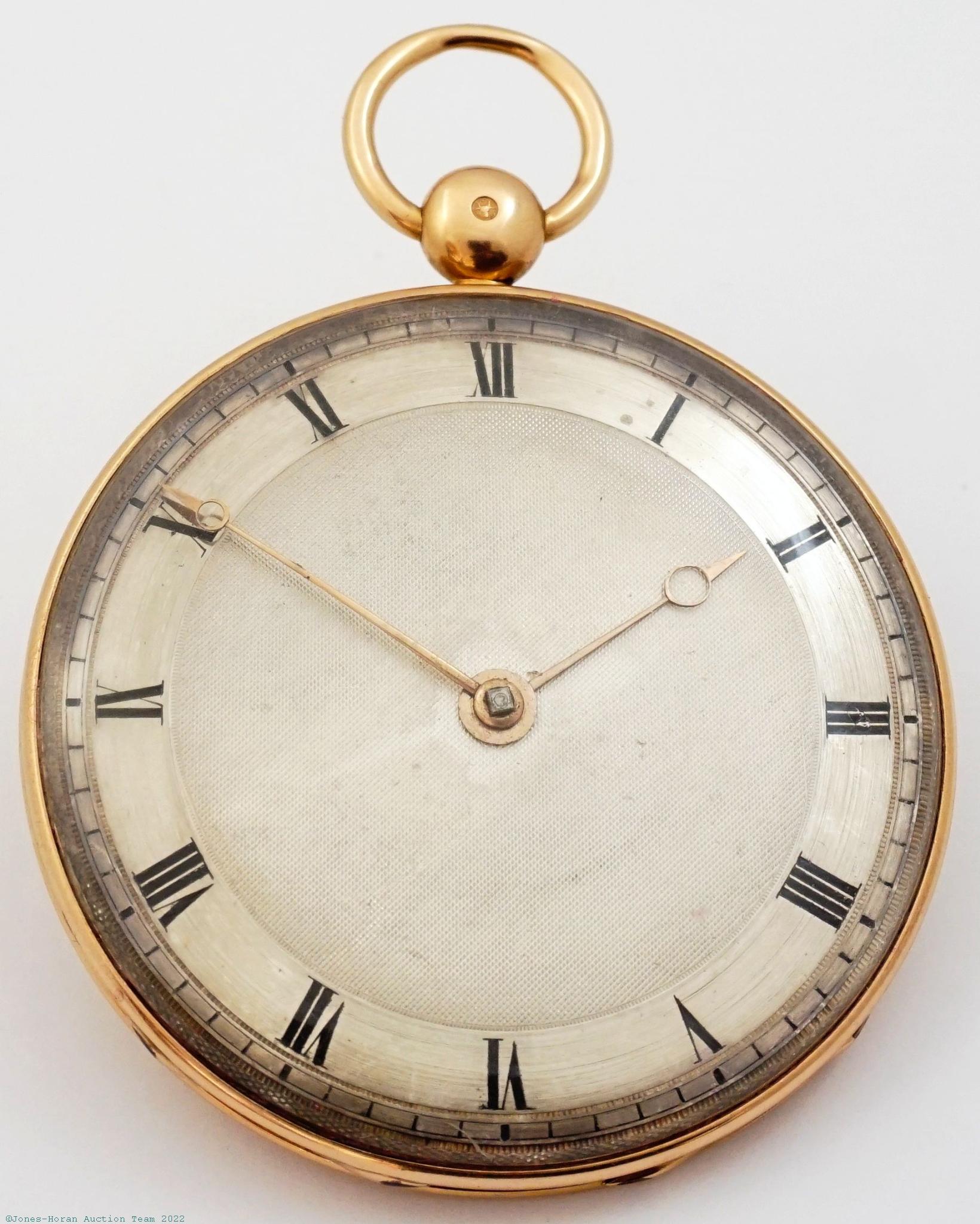 EPW - John Cross, Charterhouse Square, London, lever fusee, 52mm, 18K gold OF original case, London date hallmark is rubbed but appears likely for 1831, casemaker's "C A P" marking in cameo, white enamel dial, KWKS, lever escapement with capped lever, 13J, gilt mvt with gilt locking dust-cap, s#37784. Gross weight of assembled watch 90.2 dwt (140.4 g).