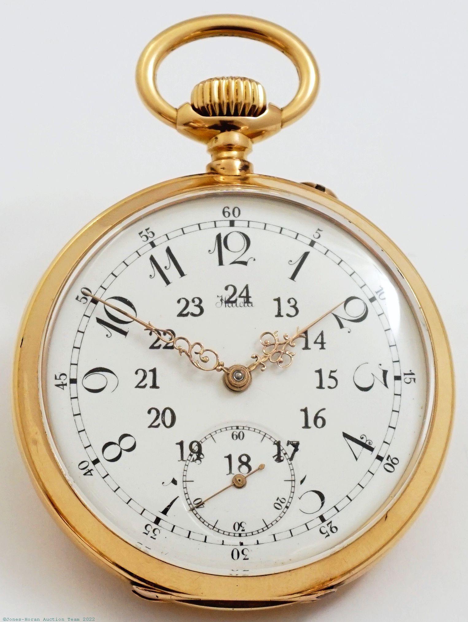 EPW - Halda Fickurfabrik, Swedish, 49mm, 18K gold OF original case, signed gold cuvette with aperture allowing adjustment of unique regulator design, white enamel SS dial with 13 to 24 hour indications, fancy gold Louis XV style hands, SW-pin-set, fully capped lever escapement with counterpoise, 19J, gilt mvt, no visible s#. Comes with a fitted leather box marked for retailer Algot Carlsson of Falköping, Sweden. Gross weight of assembled watch 60.9 dwt (94.9 g).