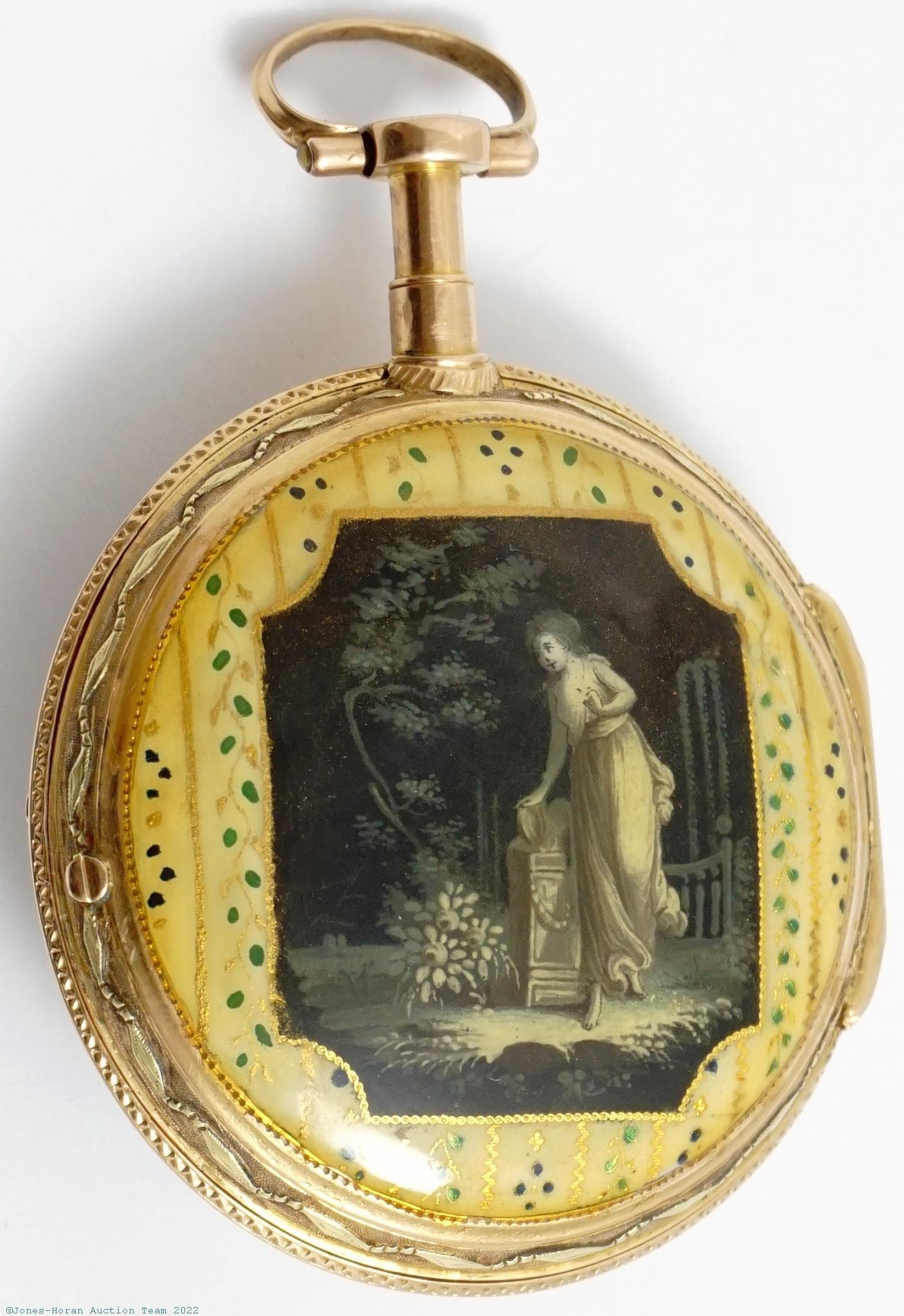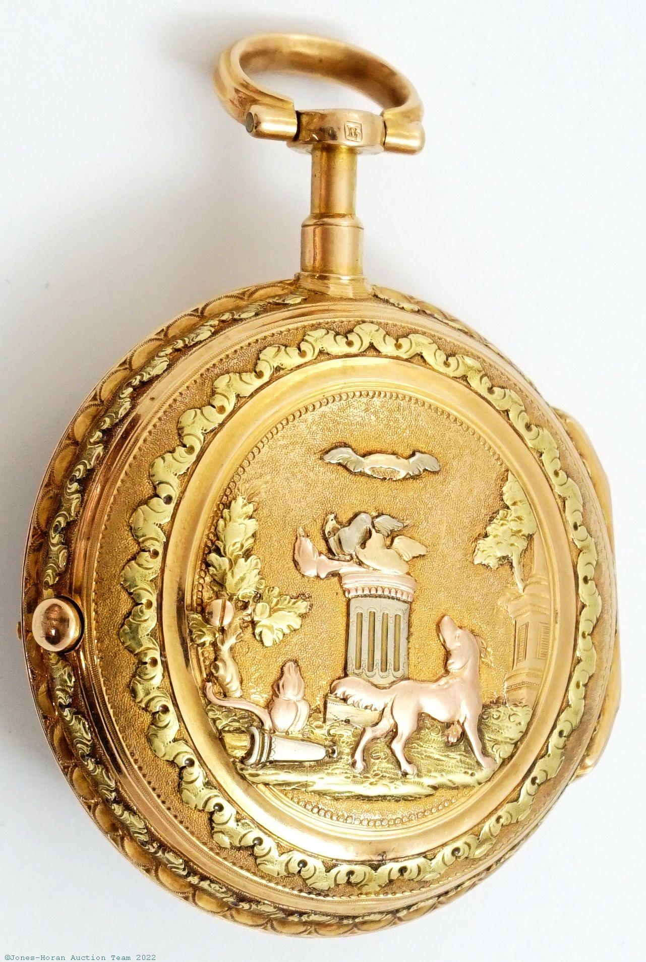EPW - Meyer a Paris, verge fusee, 43mm, 18K multicolor gold OF original case with attractive scene including a walking dog in foreground, white enamel dial with winding aperture at 3:30, fancy gilt Louis XV style hands, KWKS, verge escapement, gilt mvt with pierced and foliate scrolled two-footed balance bridge, s#481. Gross weight of assembled watch 40.1 dwt (62.4 g).