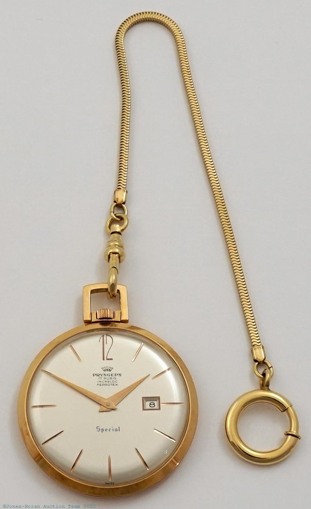 EPW - Pryngeps, Swiss, 40mm, 18K gold OF original case with "J.E.M." initials to rear (for Joseph E. Murray, M.D. with his first initial being located centrally on the case rear), base metal spacing ring around mvt, silvered dial with date aperture at 3, SW-SS, lever escapement with capped escape wheel, 17J, satin gilt finish, no visible mvt s#. Comes with a Pyrngeps marked padded box and with a 7.5 inch gold-plated chain. Gross weight of assembled watch 22.8 dwt (35.6 g). This piece is from the estate of Joseph E. Murray, M.D. who was an American plastic surgeon who performed the first successful human kidney transplant on December 23, 1954. In the decades to follow this historic accomplishment, Murray was to continue advancing the field of transplantation and in 1990 was honored with the Nobel Prize in Physiology or Medicine