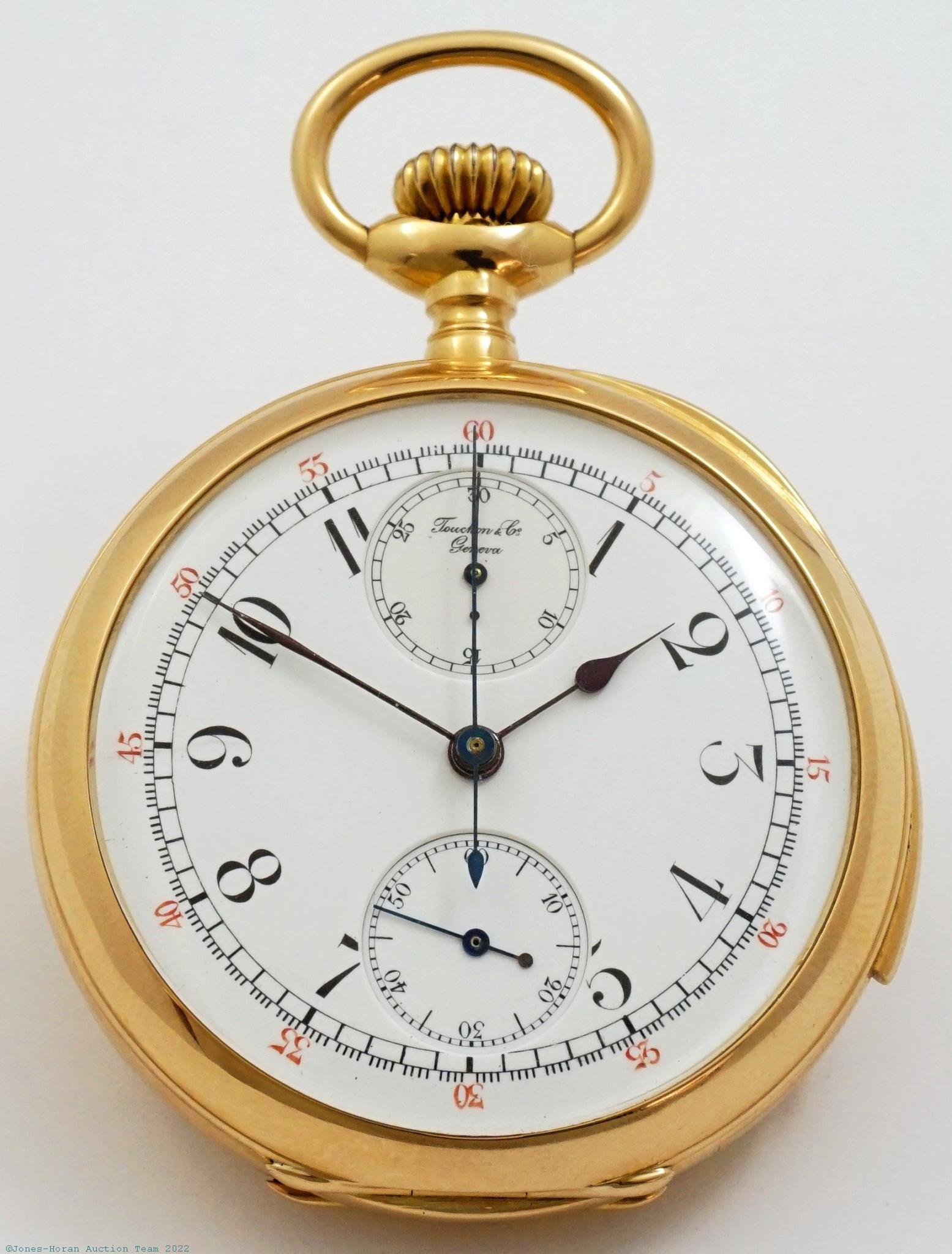 EPW - Touchon & Co, Geneva, minute repeater with chronograph and 30-minute register, 52mm, 18K gold OF original case, gold cuvette, white enamel DS dial, SW-SS, lever escapement with capped escape wheel, likely 30-33J, fausses-côtes pattern nickel damascene, s#21984 with matching serial number within case. Gross weight of assembled watch 69.9 dwt (108.8 g).
