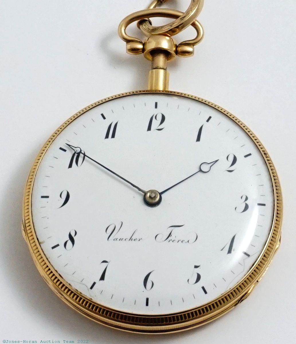 EPW - Vaucher Freres, early minute repeater, 59mm, 18K gold (tested) OF original case, signed gilt cuvette, white enamel dial, KWKS, cylinder escapement, 4J, gilt mvt with standing barrel, s#11050 to cuvette. Comes with a short gold-filled chain and a 10K gold (tested) winding key. Gross weight of assembled watch 85.9 dwt (133.6 g). A very interesting early minute repeater which notably features its strike cadrature mounted visibly atop the movement's back plate.
