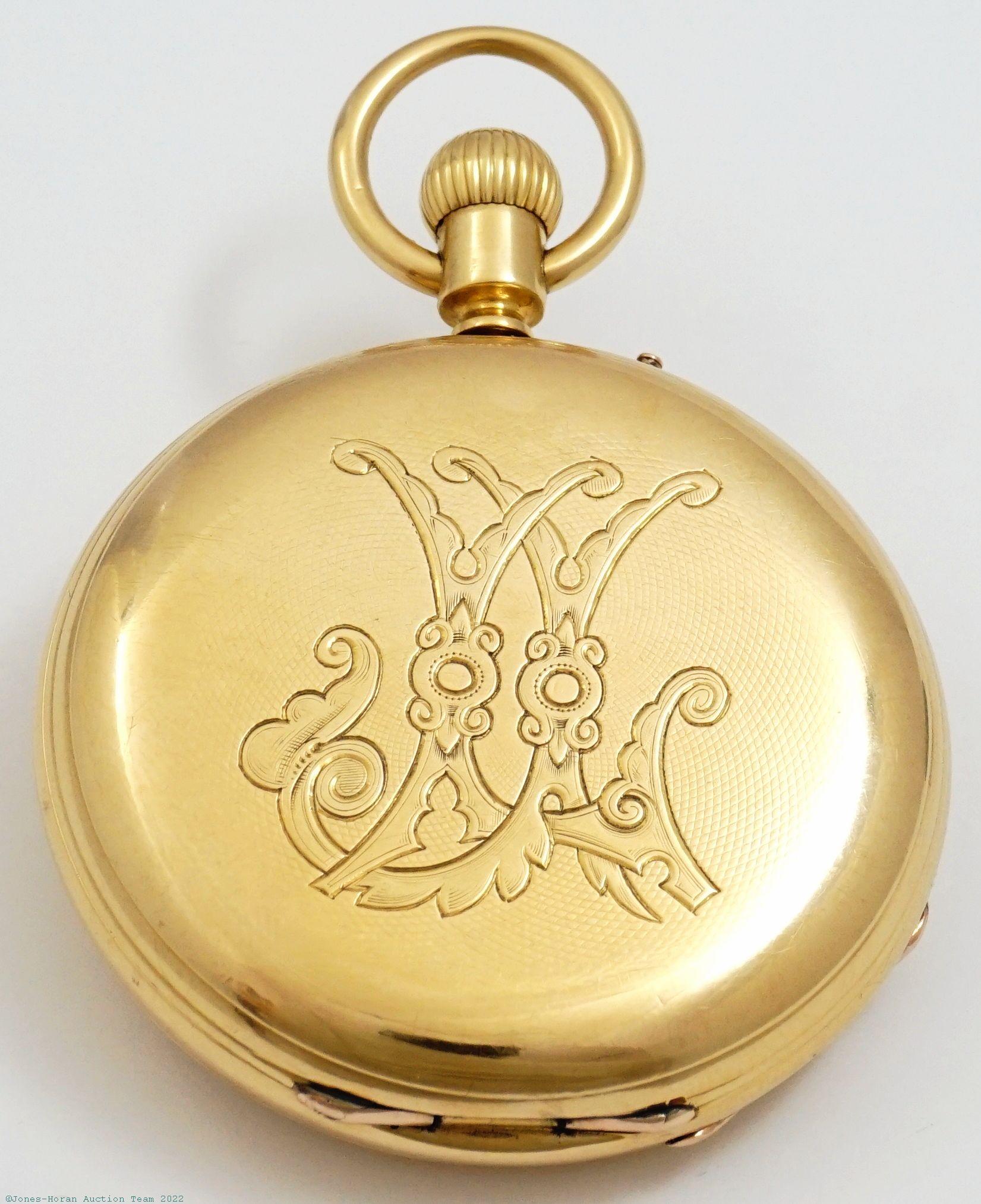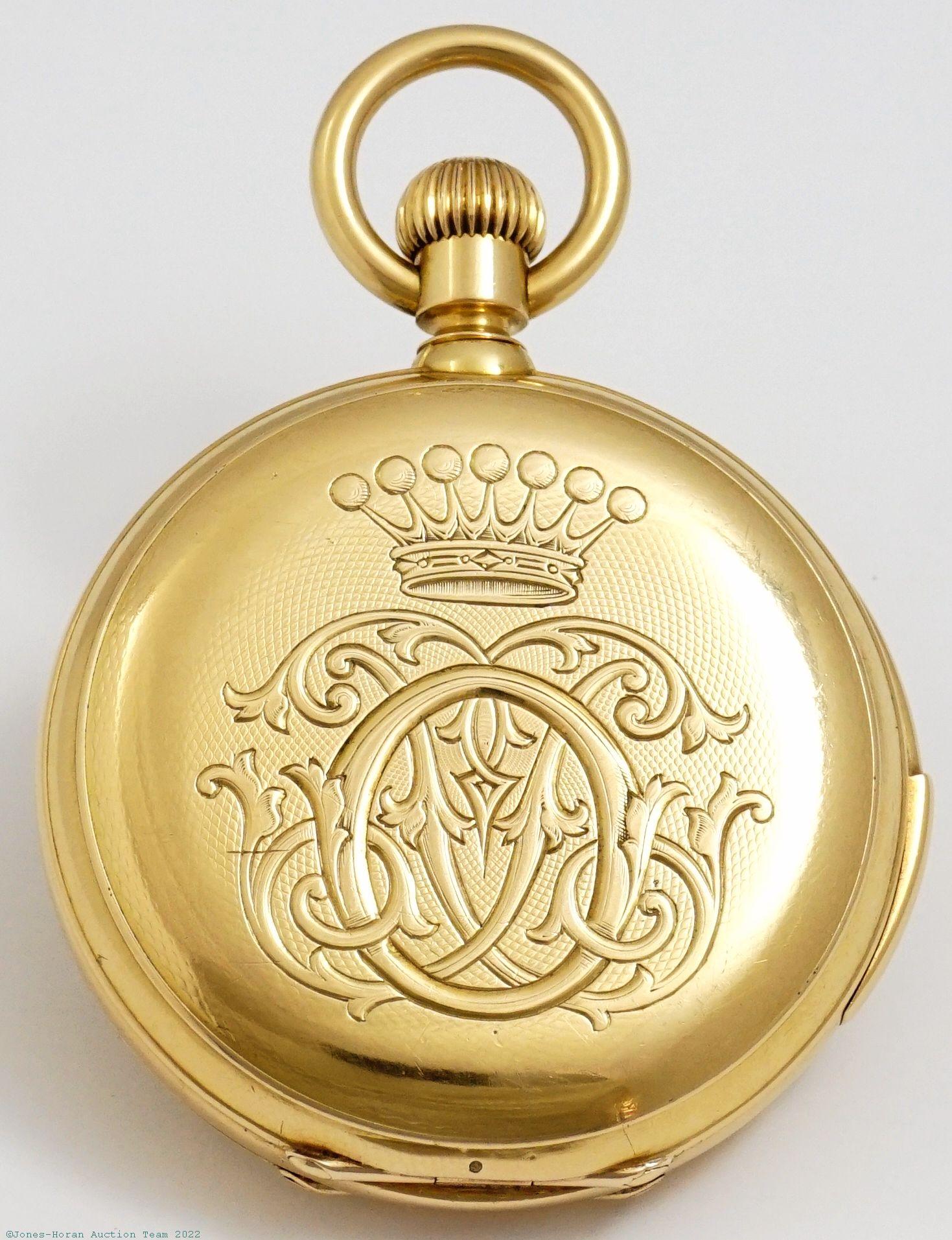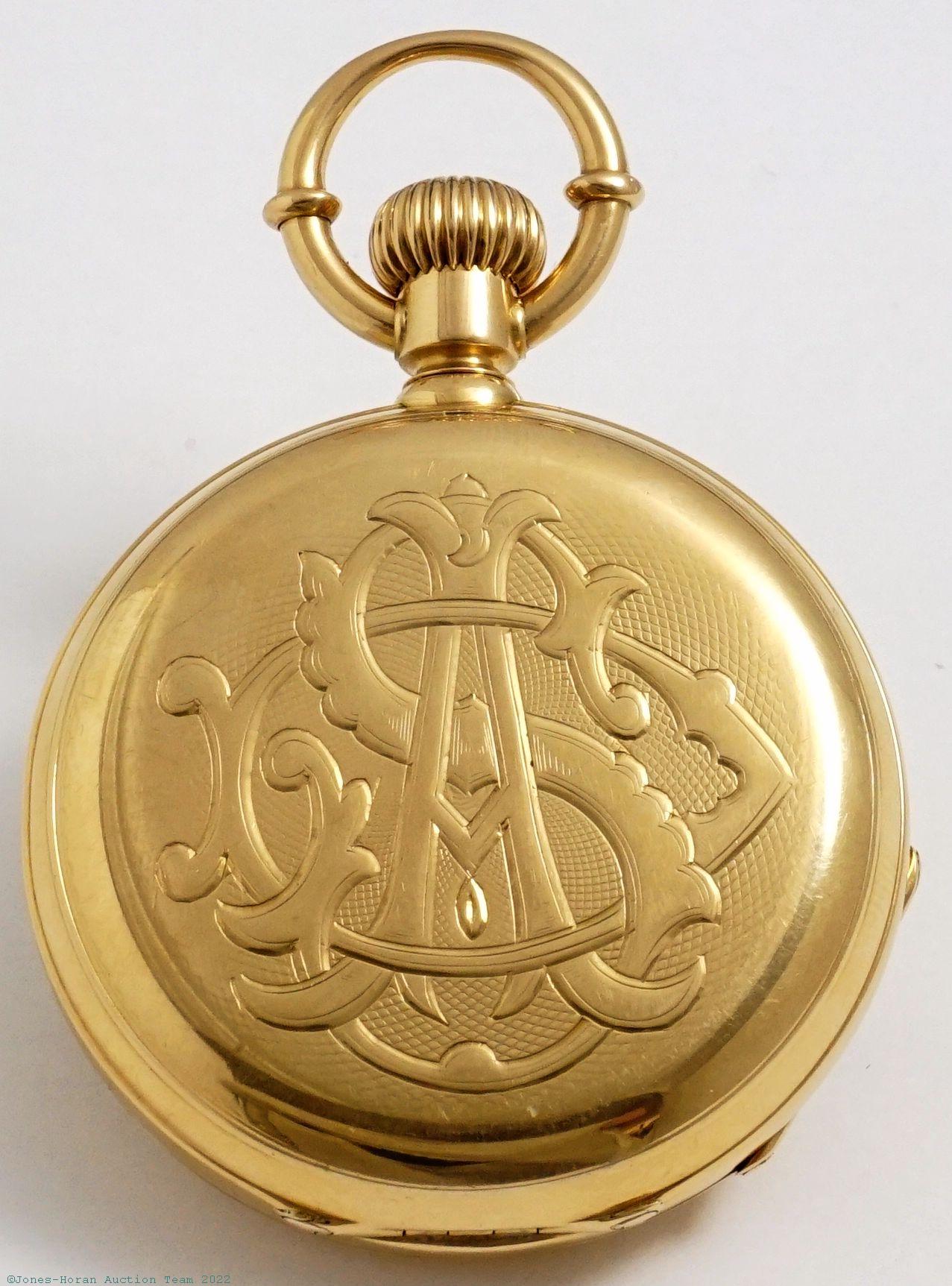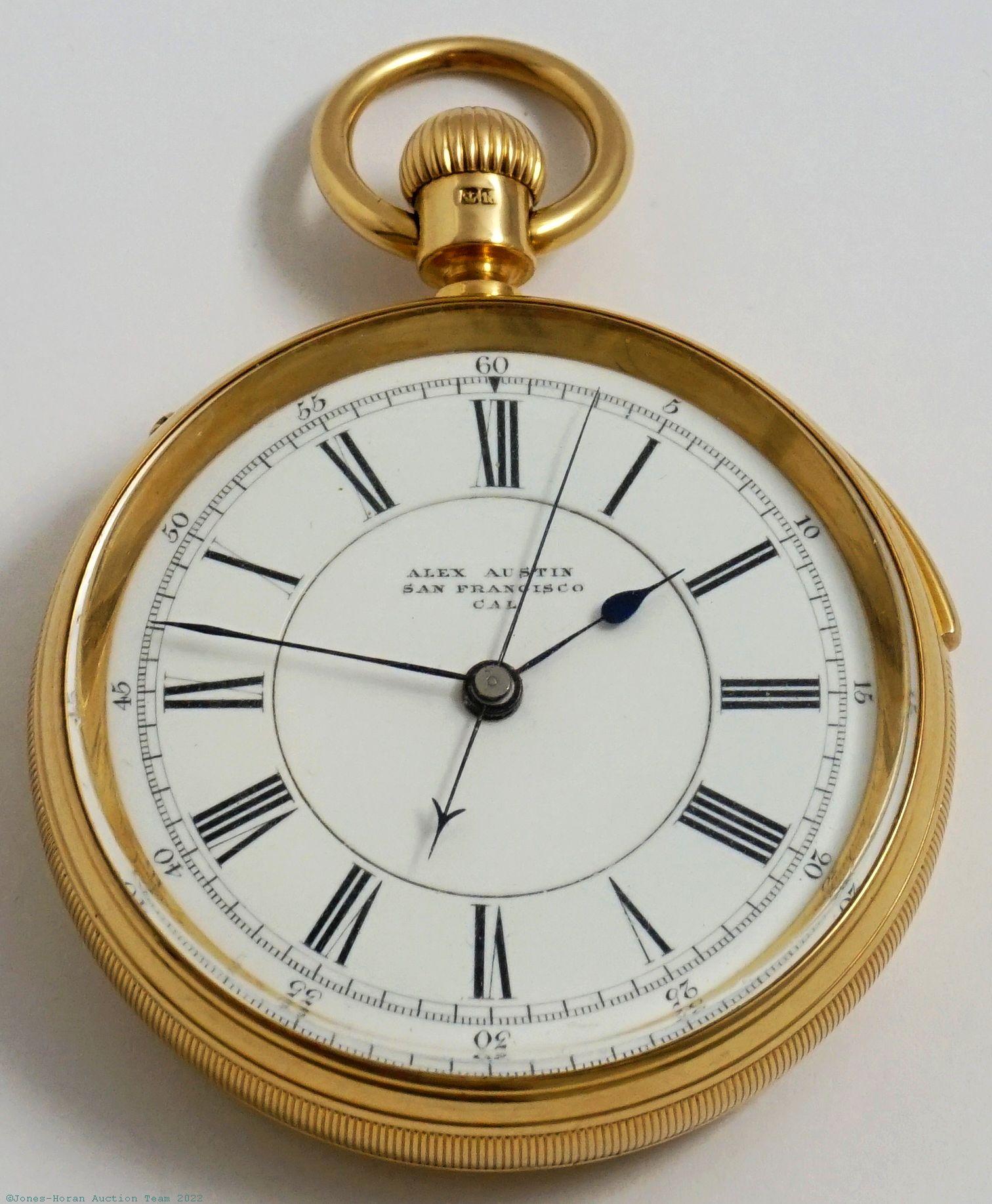 EPW - English, quarter-hour repeater with chronograph, mvt and dial marked for Alex Austin of San Francisco, California, 49mm, heavy 18K gold OF original case with red and royal blue enameled initials to rear, bearing London hallmarks for 1876 and "A N" marking in cameo for Adolph Nicole, white enamel SS dial, SW-pin-set with Adolphe Nicole's 1844 patented winding and setting system and featuring later improved version filed by his nephew David L.A. Nicole in 1855, fully capped lever escapement, at least 19J, gilt mvt, s#8492 with matching serial number within case. Gross weight of assembled watch 71.2 dwt (110.8 g). An elegant high grade repeating chronograph, we believe this watch was bespoke for Alexander Austin who was a tax collector in San Francisco at its time of production.