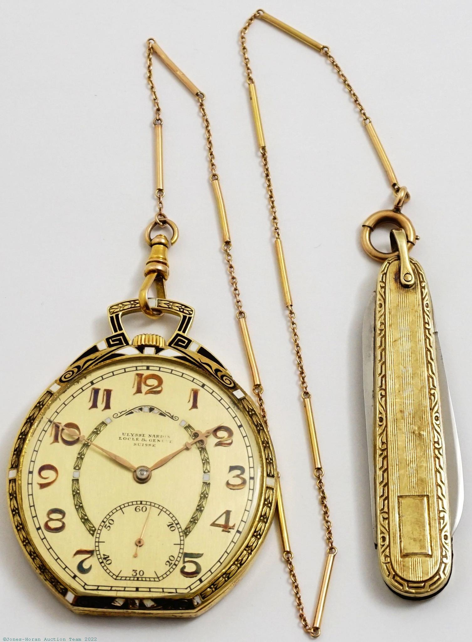 EPW - Ulysse Nardin, Locle & Genève, 42mm width x 53mm to top of bow, 18K gold barrel-shaped original Ulysse Nardin case with elegant black and white enameling to bezel, rear perimeter and bow, metal dial with applied gold numerals, SW-SS, lever escapement with capped escape wheel, 18J, wheel satin nickel finish, s#96527. Comes as pictured with a 12.5 inch 14K gold chain and with a 14K green gold penknife. Gross weight of assembled watch 29.1 dwt (45.4); gross weight of 14K gold chain 2.0 dwt (3.1 g); gross weight of penknife 10.0 dwt (15.6 g). A very attractive piece with an unusual and eye-catching case.
