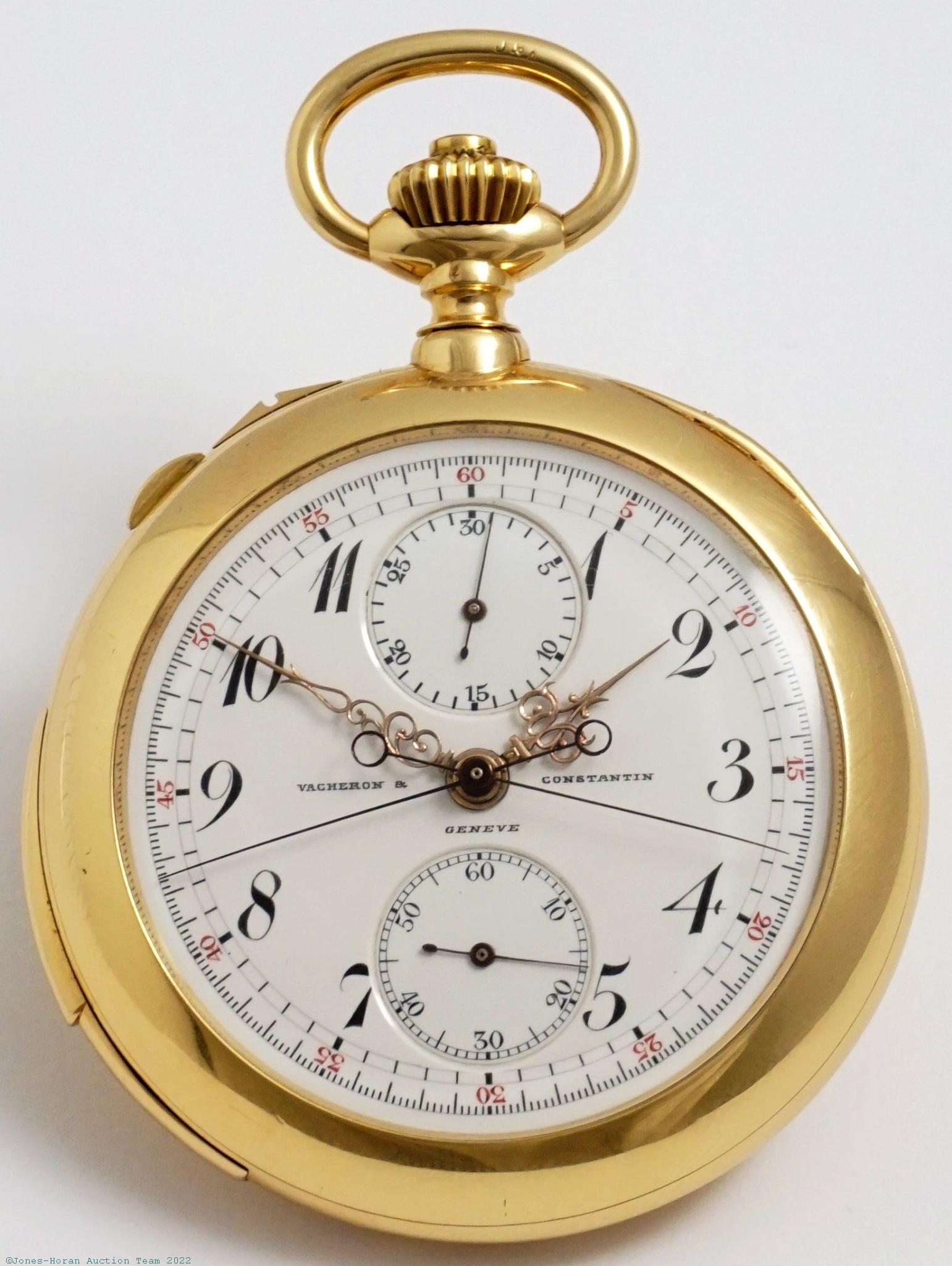 EPW - Vacheron & Constantin, Genève, minute repeater with split-seconds chronograph and 30-minute minute register, 49mm, 18K gold OF original case with small Jurgensen-style lips, slide on band at 11 to prevent chronograph activation, gold cuvette, white enamel DS dial, fancy gold Louis XV style hands, SW-SS, fully capped lever escapement with counterpoise, likely 33-39J, wheel satin nickel finish, s#318416. Gross weight of assembled watch 65.9 dwt (102.4 g).