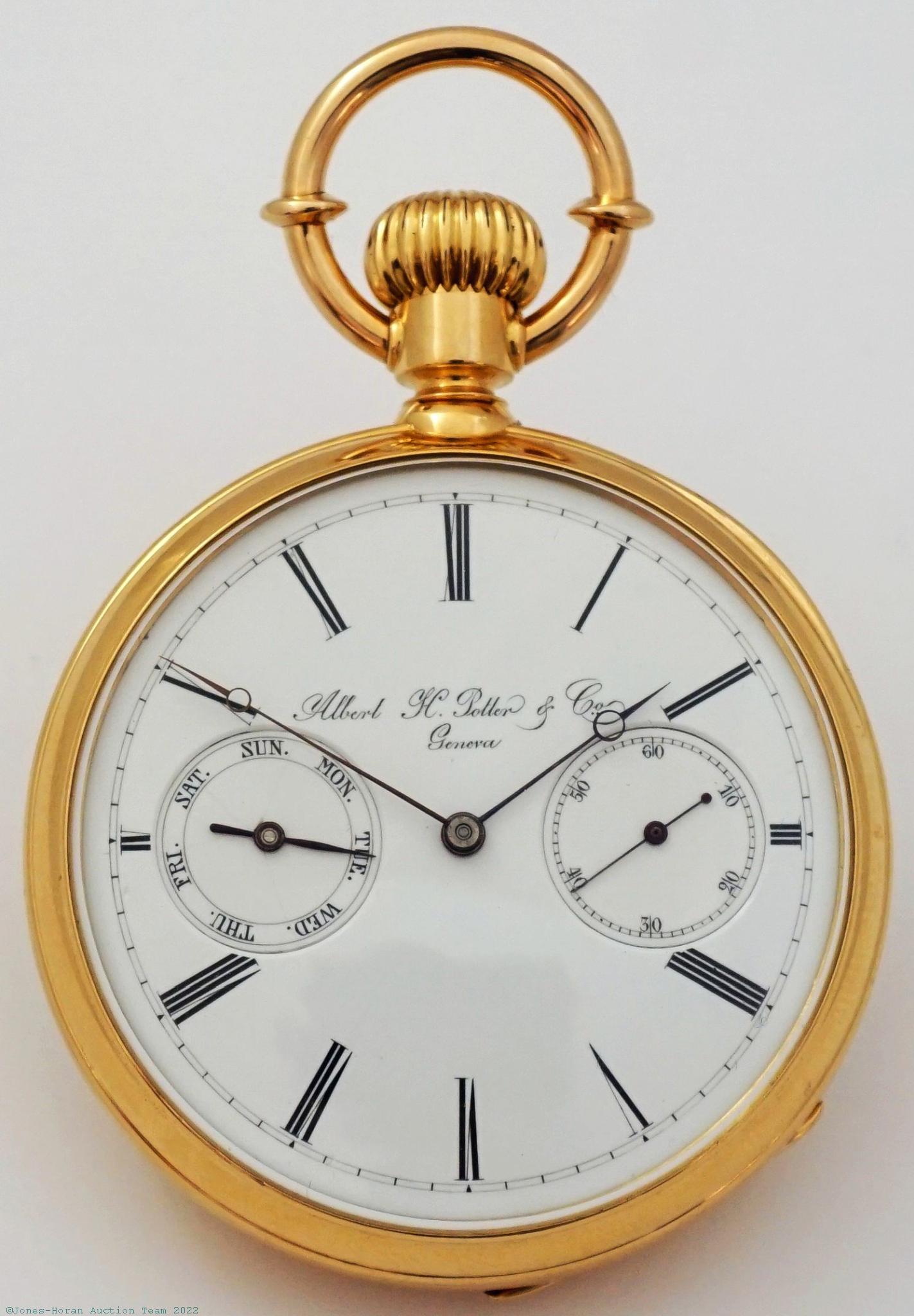 EPW - Albert H. Potter & Co, Geneva, lever chronometer with day register, 50mm, 18K gold original Albert H. Potter & Co signed OF case with trademark balance wheel logo inside rear, small Jurgensen-style lips, glazed observation cover over mvt, bow with chain guards, white enamel DS dial, SW-SS, fully capped lever escapement with counterpoise, 20-21J, fausses-côtes pattern nickel damascene, s#611. Gross weight of assembled watch 75.1 dwt (116.8 g). An excellent example of this renowned top maker's work, Albert H. Potter was born in New York in 1836 though the majority of his watchmaking activity took place after his emigration to Switzerland in about 1875.