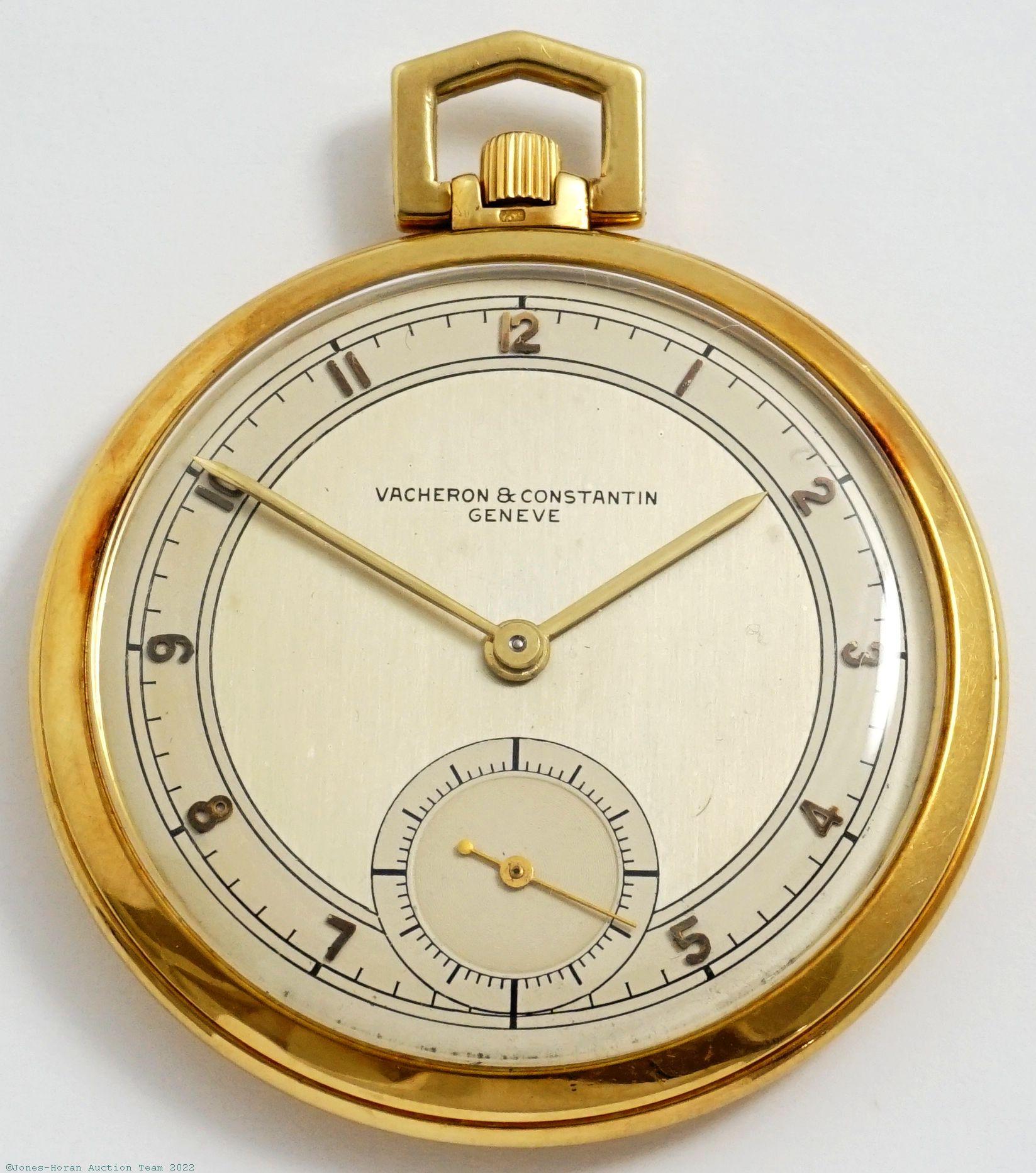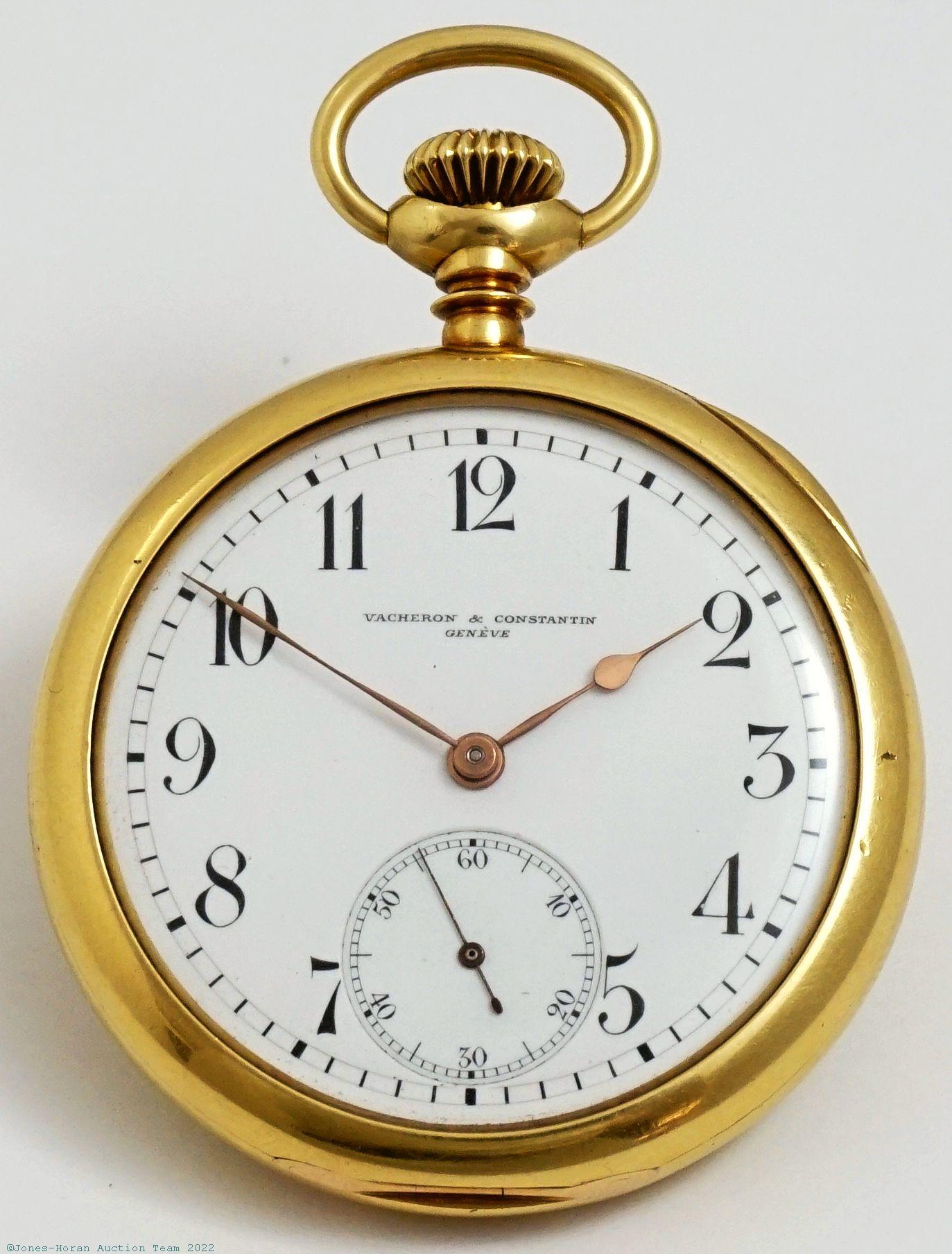 EPW - Vacheron & Constantin, Genève, 51mm, heavy 18K gold original J&S (Jeannot & Shiebler) HC for North American market, beautiful engraving detail including fancy monogram initials to front, gold cuvette, white enamel SS dial with elegant Arabic hour numerals, SW-LS, fully capped lever escapement with moustache counterpoise, 20J, wolf's tooth winding, pattern nickel damascene, s#273425. Gross weight of assembled watch 77.0 dwt (119.8 g).