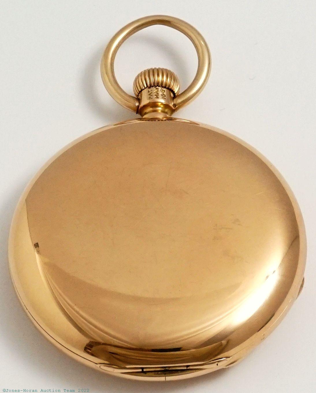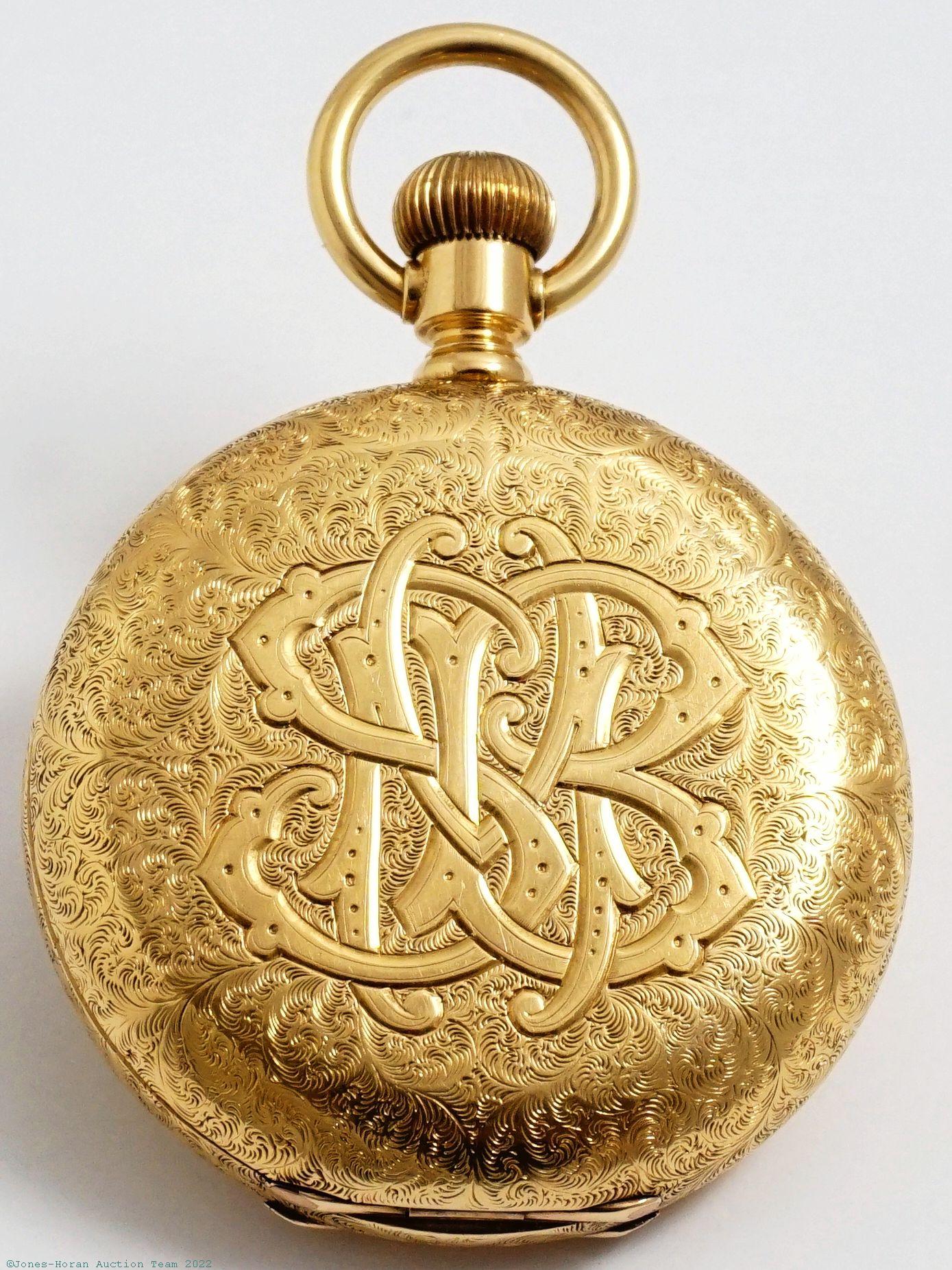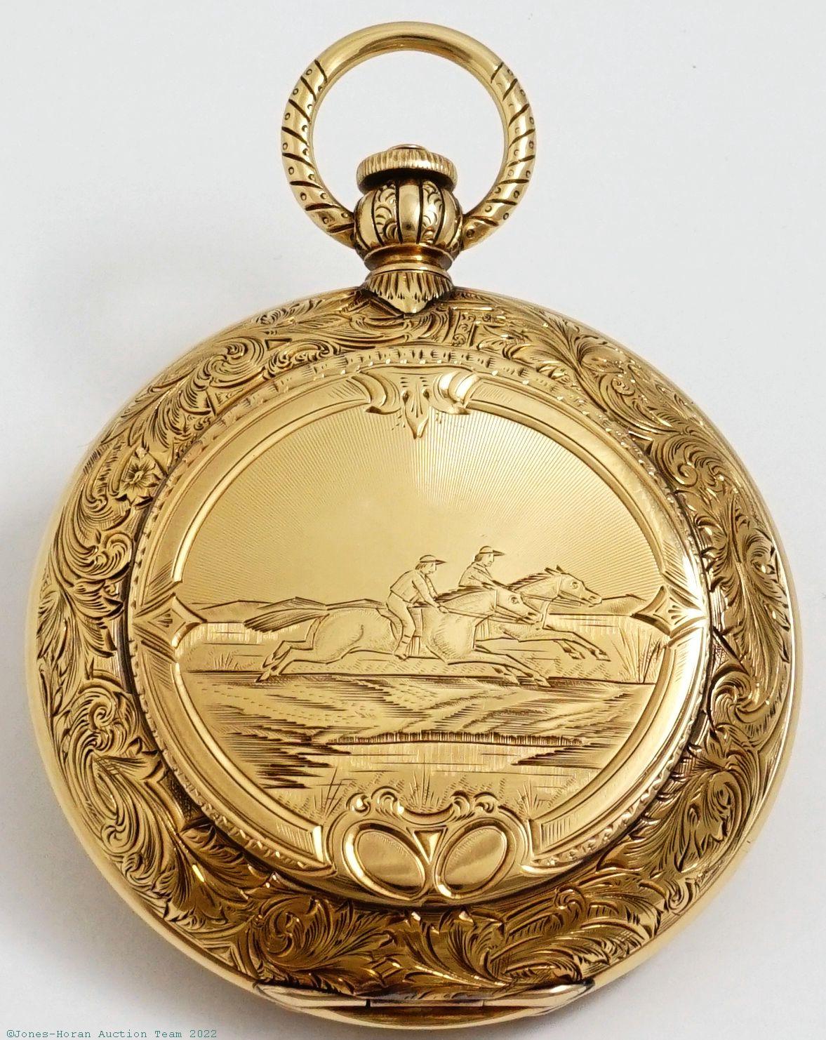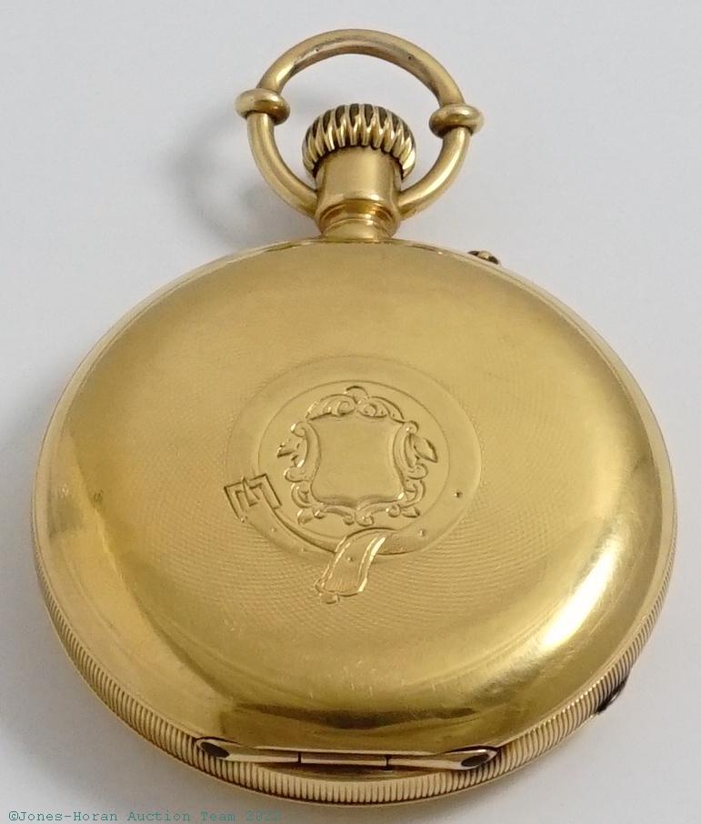 EPW - Aug. Haldimann, Locle, 54mm, heavy 18K gold original HC, gold cuvette engraved "John L. Brigham, Dr. Thomas Hall, Frank H. Brigham, William A. Brigham," bow with chain guards, white enamel SS dial, SW-button-set, fully capped lever escapement with counterpoise, 19J, wolf's tooth winding, fausses-côtes pattern nickel damascene, s#10389 within case. Gross weight of assembled watch 85.6 dwt (133.1 g). This watch originally belonged to John Lowell Brigham who was a cavalry officer on the staff of General Philip Henry Sheridan. He mustered in on 10/1/1861 as a comm Sergeant; shortly thereafter he was promoted to 1st Lieutenant on 3/7/1862. On 10/25/1864 he was again promoted to the rank of Captain and finally on 8/28/1865 was promoted to Major by Brevet. He was a 33rd degree Mason of the DeWitt Clinton Consistory No 1 order in Boston. John died in 1874 at the ripe young age of 42; he's buried at Mt. Auburn Cemetery in Cambridge, MA. The fourth name engraved on the cuvette, William A. Brigham, was John's great-grandson and this engraving was added upon his birth in 1943.