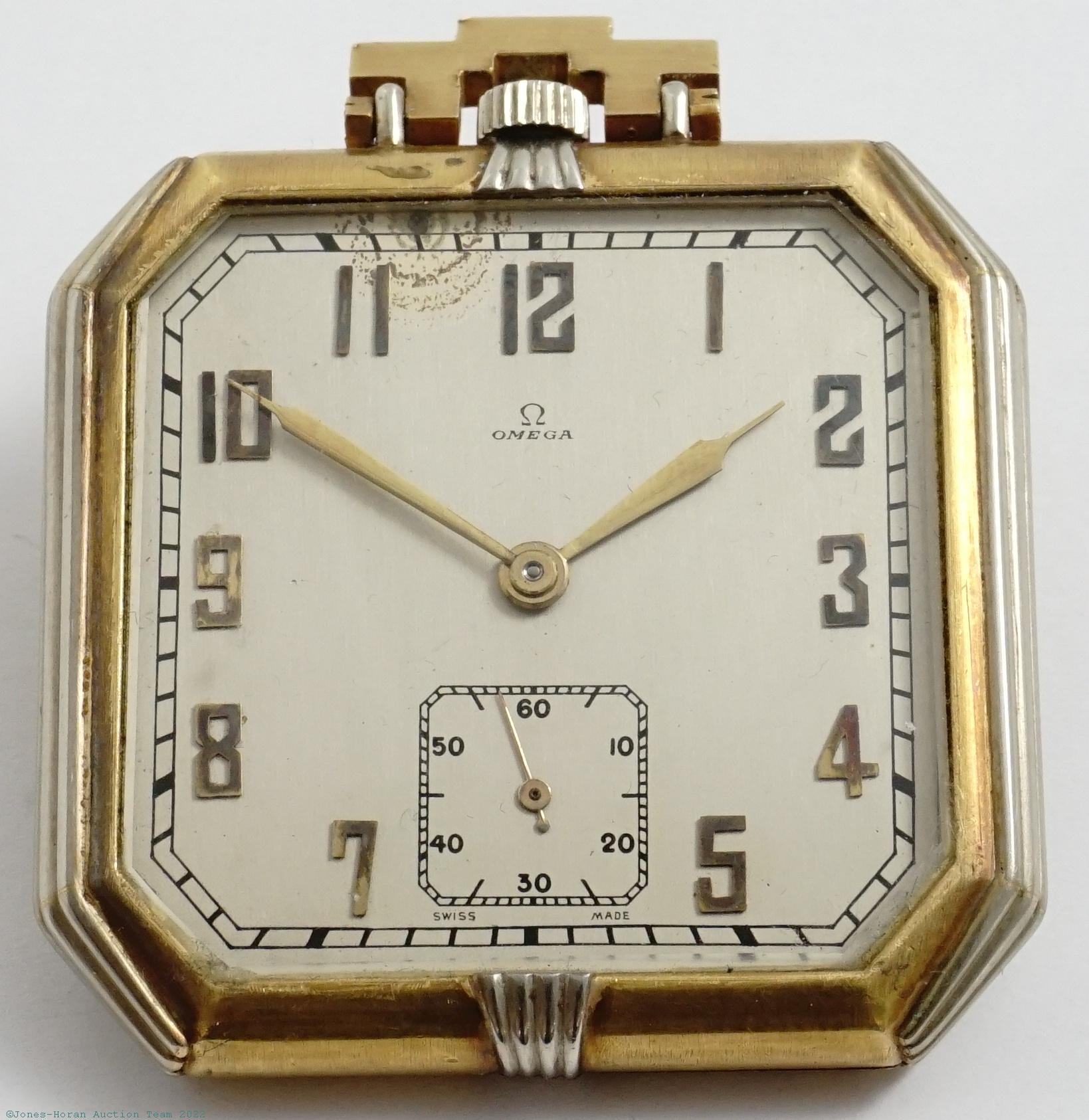 EPW - Omega, Swiss, 43mm x 49mm bottom to tip of bow, heavy two-tone 18K green and white gold OF original case with beautiful Art Deco design, blue lapis and black onyx cabochons set to rear, stepped bow, spacing ring around mvt, refinished silvered dial with applied gold numerals, SW-SS, lever escapement, wheel satin nickel finish, s#6469083. Gross weight of assembled watch 44.6 dwt (69.5 g). A strikingly impressive Art Deco piece, ranking high among the most attractive gold cased Omega pocket watches we have encountered.