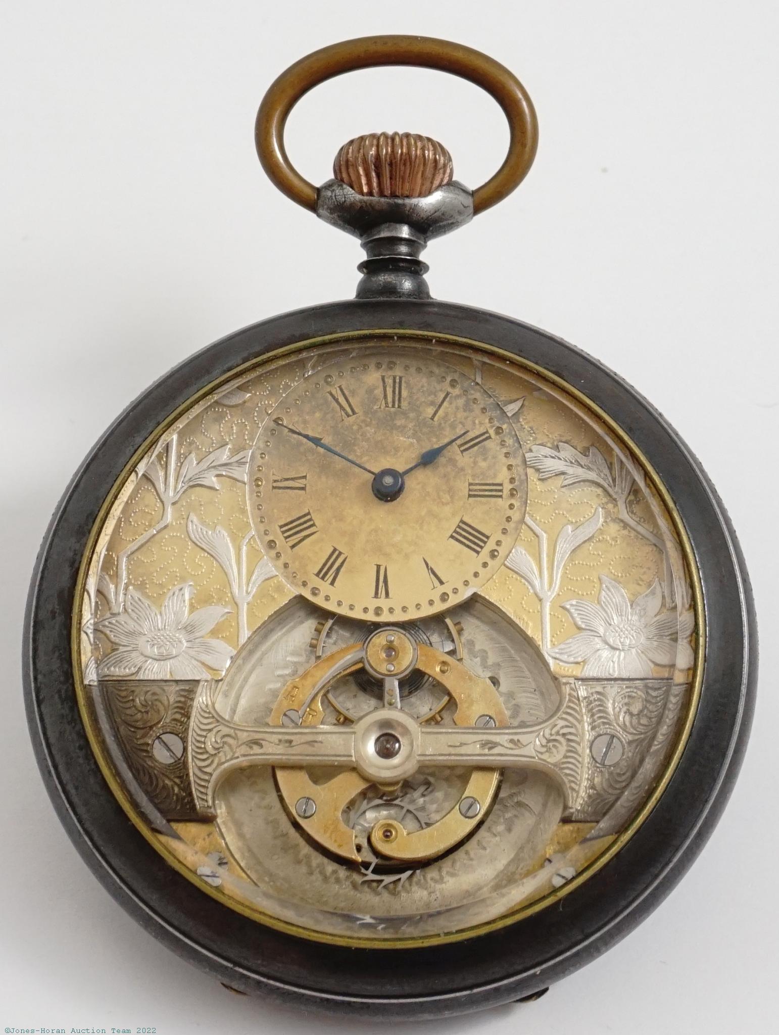 EPW - Mobilis, Swiss, one-minute tourbillon with lever escapement on rotating platform, 53mm, gunmetal OF original case, gilt dial with ornamental surround including silvered floral detail, SW-SS, rotating escapement platform which functions also as a seconds-register, likely 15J, gilt mvt with fully enclosed back plate bearing patent markings, s#102200.