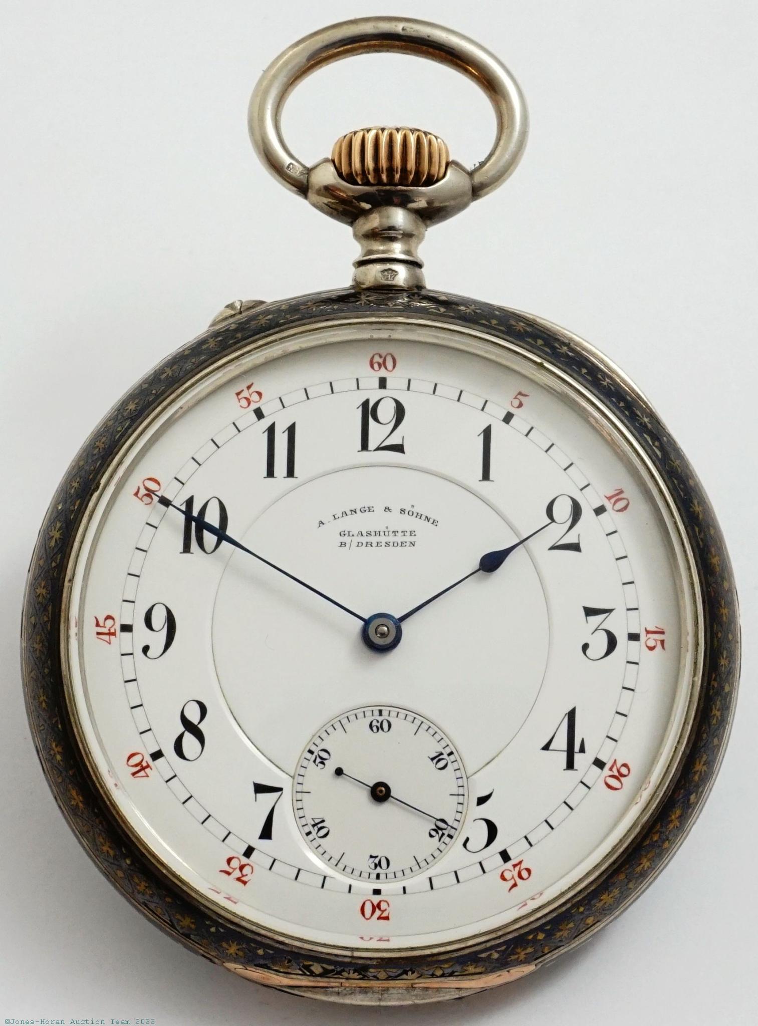 EPW - A. Lange & Söhne, Glashütte, 53mm, .900 silver OF original A. Lange case with attractive niello finish, gold hinges, white enamel DS dial, SW-pin-set, lever escapement with gold pallet and escape wheel, 15J, gilt mvt, s#42403 with matching serial number within case.