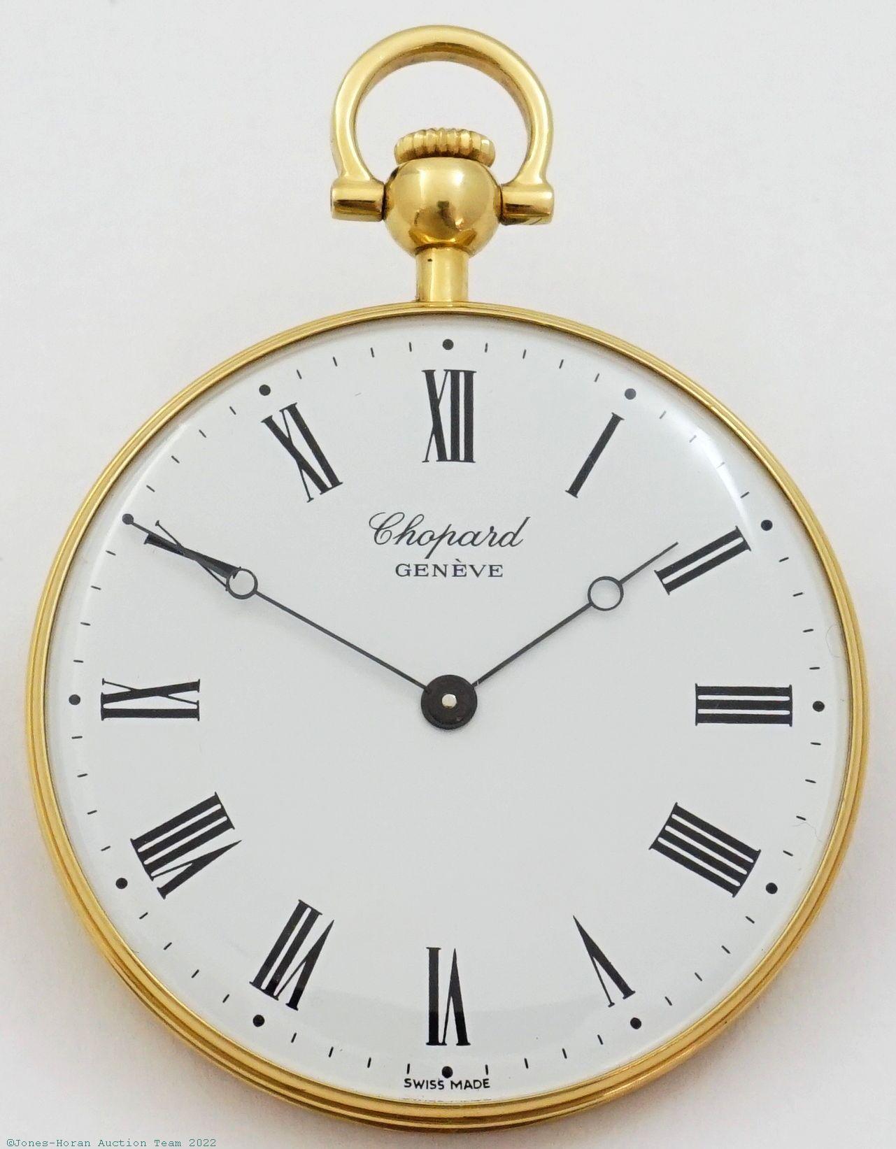 EPW - Chopard, Genève, 42mm, 18K gold OF original LU. Chopard & Cie case with 1975 presentation to rear, base metal spacing around mvt, painted metal dial, SW-SS, lever escapement, 17J, fausses-côtes pattern gilt damascene, s#3004 and s#81752 within case. Comes with a leather Chopard Genève marked box. Gross weight of assembled watch 29.7 dwt (46.3 g).