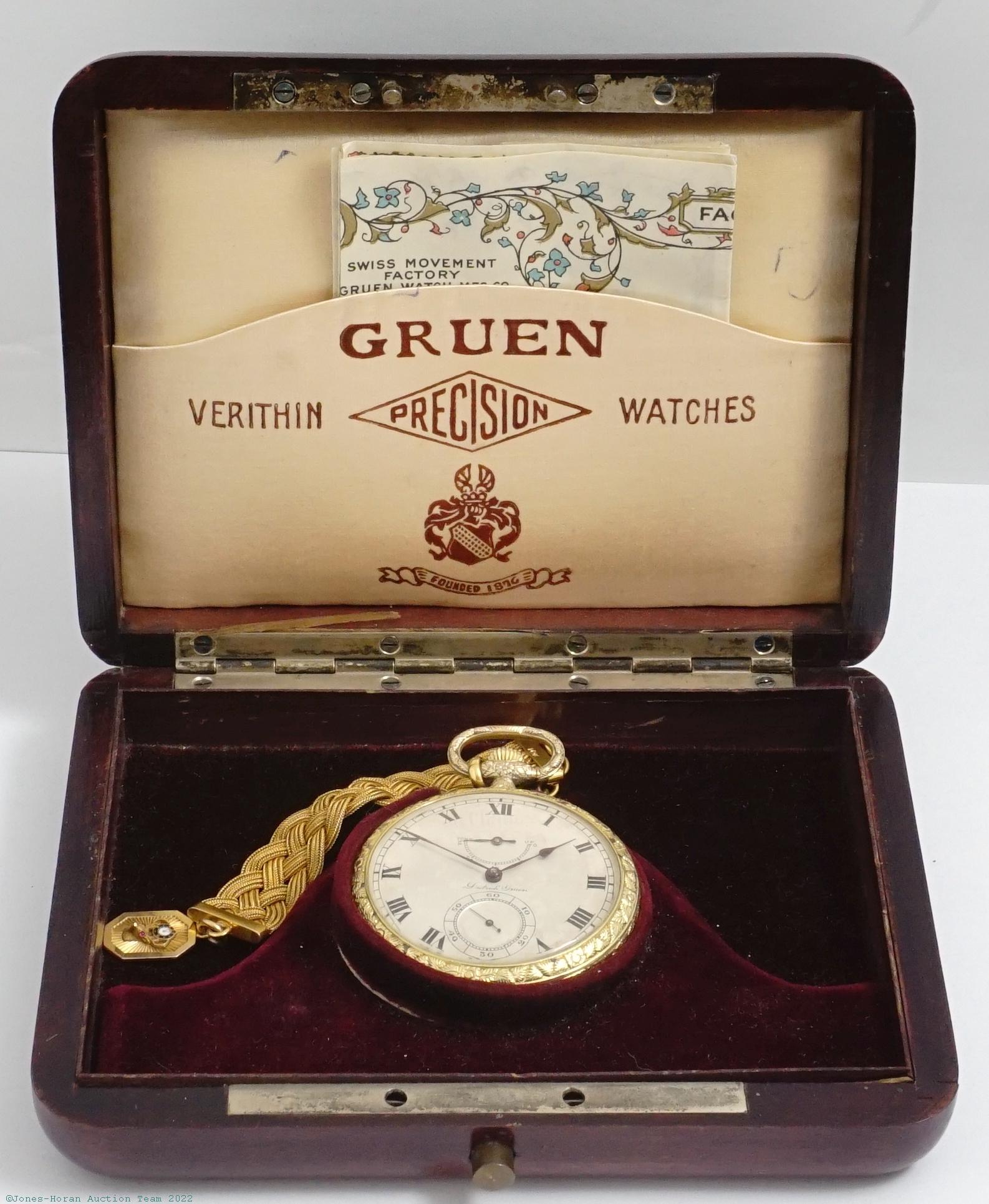 EPW - Gruen Watch Co, Dietrich Gruen with winding indicator, mvt marked "Chronometer Balance," 48mm, 18K green gold OF original Gruen case with "C A A" monogram initials to rear, florally engraved bezel, band, pendant and bow, signed gold cuvette bearing attributes and also engraved "Especially Finished For C. A. A. Modeer," silvered dial, fully capped lever escapement with counterpoise, raised gold jewel settings, jeweled winding indicator, 23J, wolf's tooth winding, wheel satin nickel finish, s#41522. Comes with its original wooden presentation box, the matching paperwork for its $425 sale to Capt. C.A.A. Modeer of Astoria, Oregon dated June 14th, 1923, as well as with a 10K gold fob chain with end engraved "CAAM." Gross weight of assembled watch 59.1 dwt (91.9 g). Gross weight of 10K gold fob chain 6.9 dwt (10.8 g). A magnificent example of this prestigious top Gruen product, the sales receipt for this watch notes its original $425 cost, which was a truly staggering sum in the early 1920s. The watch, paperwork, and chain are all signed for Captain Charles Axel Alexius Modeer, who had a long and interesting life. In 1906 while serving as second officer aboard the SS City of Panama, Modeer helped rescue three men who were swept overboard which earned him a gold medal from then President of the United States Theodore Roosevelt. During World War I, he served as a commissioned officer holding the command of two vessels during the war, these being the Naval patrol vessel USS Rose which was a former light house tender, and the cargo vessel USS West Compo for one tour of duty in 1919. Following the war, Modeer served on various lighthouse tenders having been made Captain of the Lighthouse Tender Manzanita in 1929 and captained her until his retirement in 1941. His personal journals as well as pictures of him with his crew on the Manzanita can be found at the Oregon Historical Society Research Library.