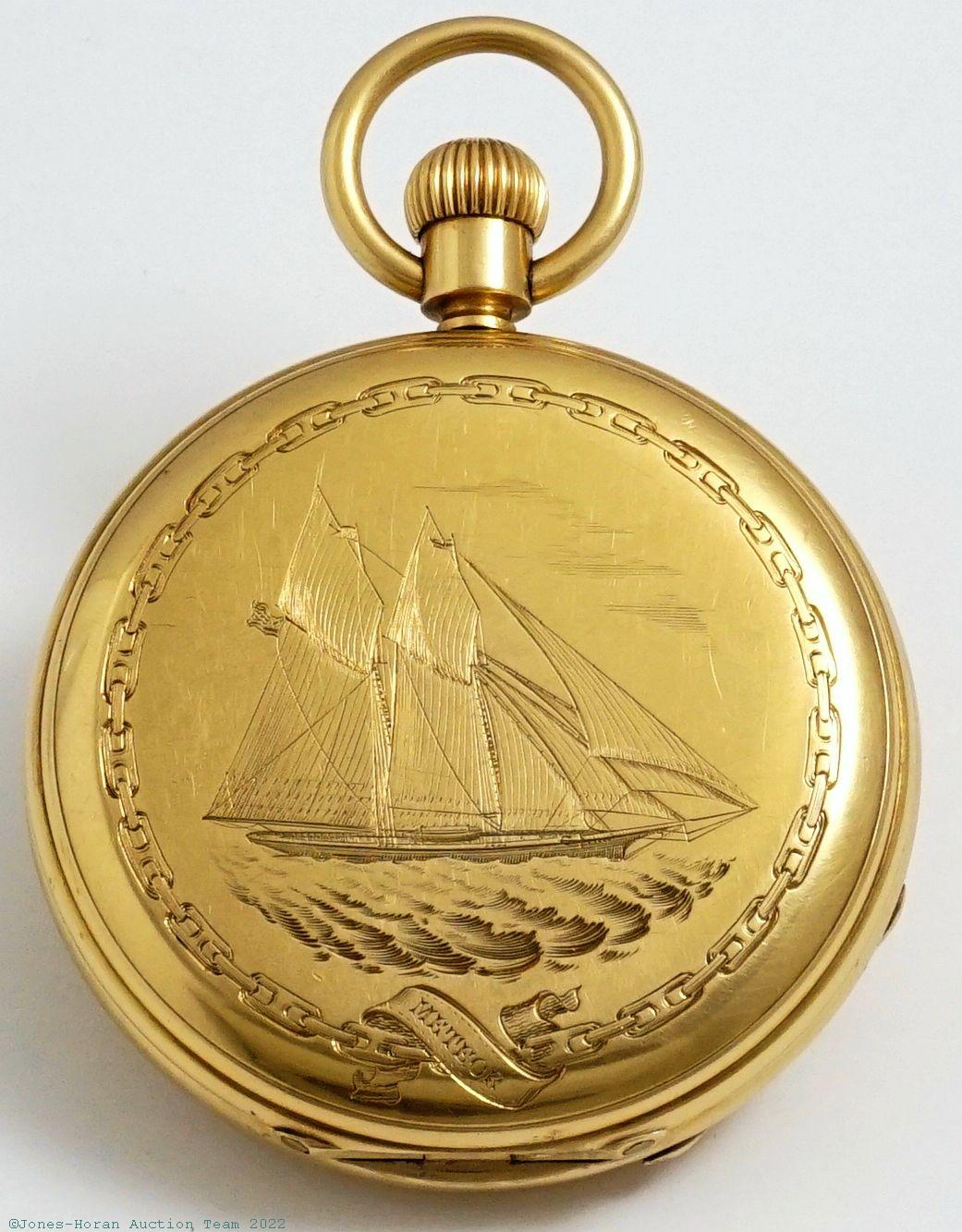 EPW - Charles Frodsham, 84 Strand, London, keyless lever, 55mm, heavy 18K gold original HC bearing London hallmarks for 1868, "C F" marking in cameo, front with engraved depiction of the sailing yacht Meteor at sea within a chain wreath, rear with presentation to renowned American shipbuilder Captain Robert Fish by Pierre Lorillard IV who was heir to Lorillard Tobacco, gold cuvette, white enamel SS dial, SW-nail-set, fully capped lever escapement, diamond endstone, 20-21J, gilt mvt, s#03814 with matching serial number to dial. Gross weight of assembled watch 103.1 dwt (160.4 g). A wonderful piece combining a beautiful nautical image with a delightful seafaring provenance, as this watch was given to Captain Robert Fish by Pierre Lorillard IV for his work in building the sailing yacht Meteor which broke the world record for sailing time from Cowes, England to Lisbon, Portugal. Amusingly, in period documentation it would appear that this ship was banned from English regattas for being too "fast." Captain Fish also built the sailing yacht Enchantress for Pierre's brother George, which yacht won numerous national and international cups including the Royal Yacht Squadron's 53-mile (85 km) regatta and the New York Yacht Club's 140-mile (230 km) regatta from Owl's Head Point to Sandy Hook Lightship. Truly a fabulous piece of yachting history for both American and English collectors. (Last two pictures on this listing are not included with the watch.)