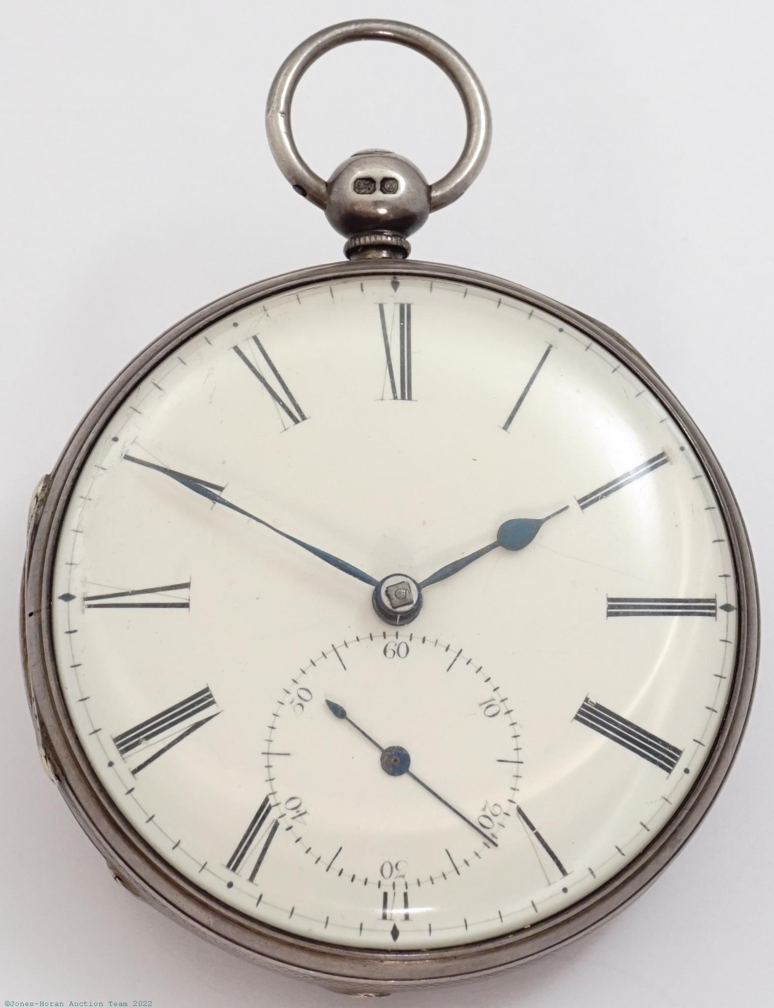 Mvt: Running, fine-plus cosmetic mvt condition overall, good gilt tone, small distortion of plate contour surrounding third wheel jewel indicative of likely past repair involving replacement of this jewel, few scattered micro-fine scratches; dial with patched edge chip at lower-left, small patched chip within hour register, flaking or small chipping around center of seconds-register, hl above seconds-register, small edge chip at right side with few adjacent additional very small edge flakes; excellent hands; case shows medium wear, scattered mild dings to rear evident as rippling of reflection, mild ding to band at upper-right, reduced engraving detail, front lift springs allowing opened lid to tilt approximately one-third toward closed with gravity, opened rear lid falling closed freely with gravity; tight bow, crown shows ample wear; good glass crystal.