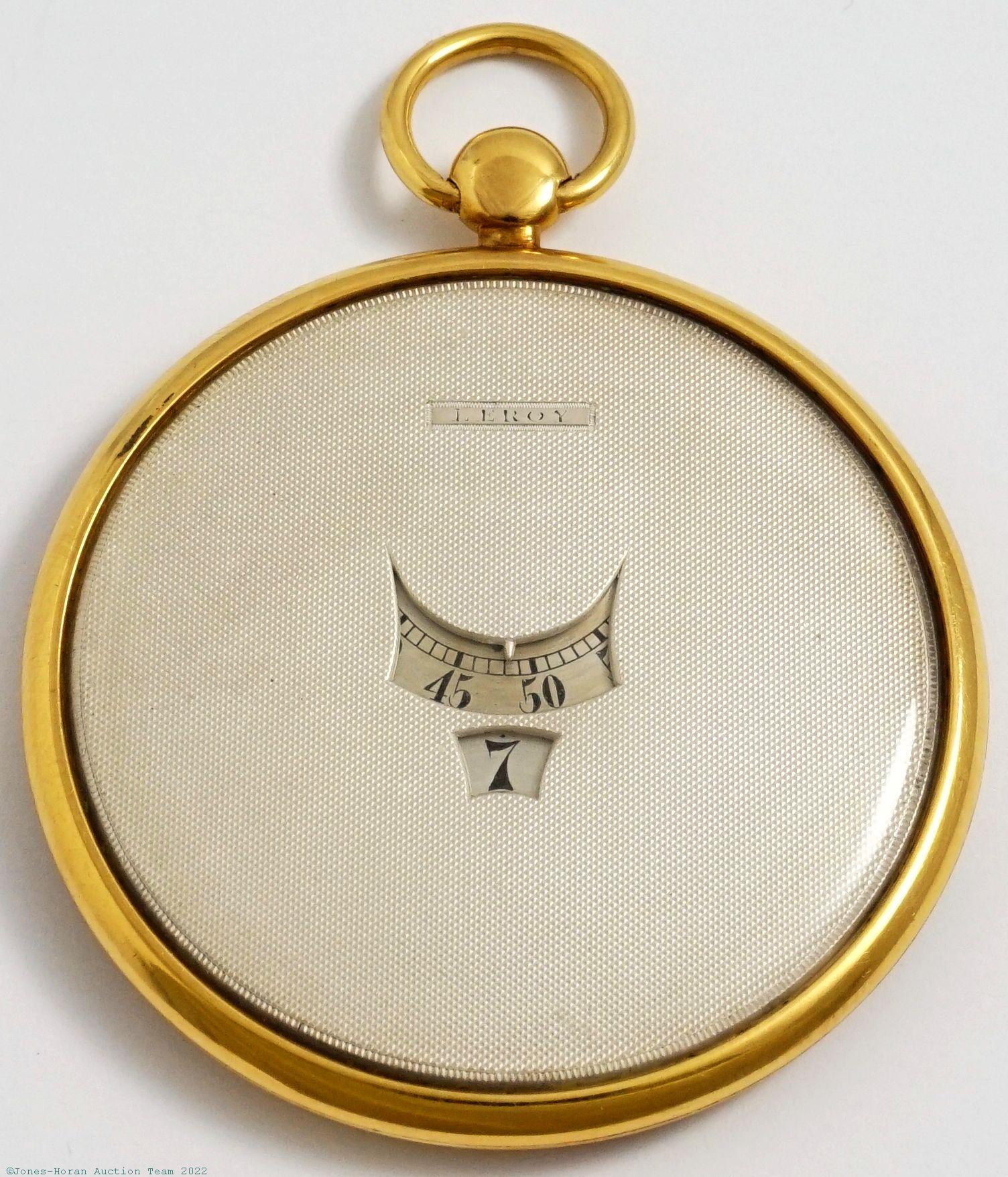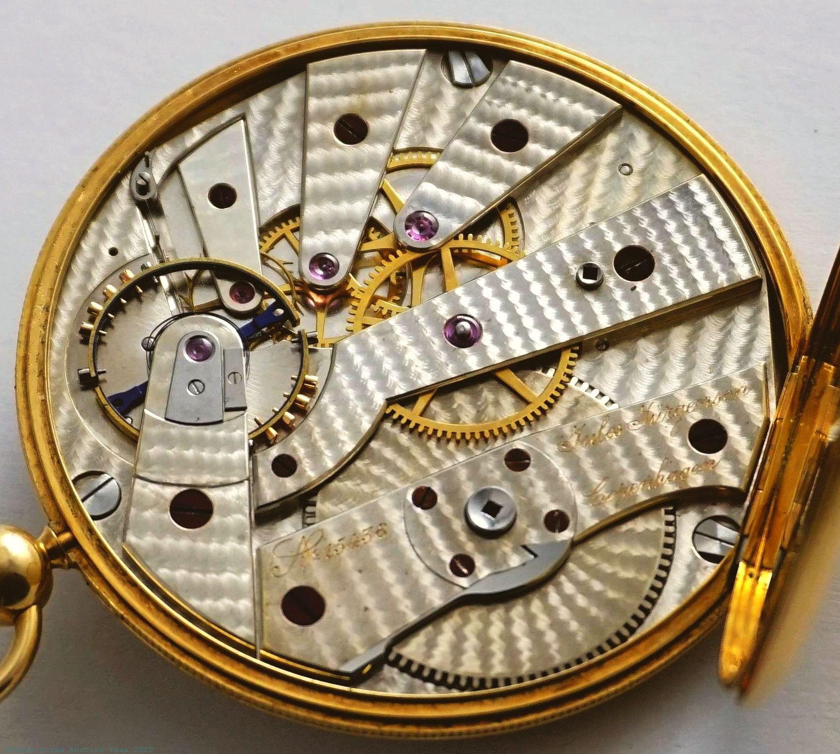 EPW - Jules Jurgensen, Copenhagen, ultra-thin pocket chronometer with spring detent escapement and spherical hairspring, 45mm, 5.7mm front to rear thickness with crystal included, 18K gold OF original case with elegant engraving inside rear of a poem and a 1903 presentation, engine turned silver dial with seconds-register at 10, signature at upper portion above off-center timekeeping chapter, KWKS via a male key, spring detent escapement, free-sprung balance with spherical hairspring, snailed nickel damascene, s#15438 with matching serial number to cuvette. Comes with a 14K gold key as pictured. Gross weight of assembled watch 25.9 dwt (40.3 g). An exceedingly rare, if not unique, piece; the present watch is unlike any other Jules Jurgensen we have handled or encountered. Even extending beyond Jurgensen products this remains by far the thinnest watch from any maker we have observed with detent escapement and spherical hairspring. Notably this watch also employs the use of a spring detent escapement, as opposed to the pivoted detent style typical of Jules Jurgensen pocket chronometers. Happily this watch has been well cared for throughout its full lifetime as its delicate balance and escapement remain in superb functional condition, but it is important to emphasize the delicacy of this piece as the balance and escapement would likely not survive any mishandling. Our watchmaker notes that the balance assembly and the detent assembly of this watch should always be removed prior to any disassembly, as even the simple act of removing or pressing on the hands could potentially put these components out of order. Please see our photos for several disassembly views of the watch, and we note the presence of "L J" initials under the dial which we believe likely identify this masterpiece as the work of Swiss watchmaker Louis Jaquet, who is described on the website of The British Museum (https://www.britishmuseum.org/collection/term/BIOG72470) as having "First worked for Patek Philippe in Geneva and then moved to his father's musical clock manufacturers. He founded his own company in c.1890 which specialized in making small watches and also ball watches in different sizes." In all, this watch is undoubtedly the most unusual Jules Jurgensen our firm has had the pleasure of handling and is absolutely a treasure for the collector of unusual Jurgensen watches!