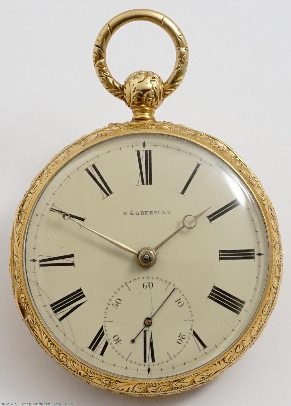 EPW - R. & G. Beesley, Liverpool, lever fusee, 50mm, 18K gold OF original B & Co. case with "William A. Brigham" engraved inside rear, cream colored enamel dial, KWKS, lever escapement, 7J, gilt mvt with gilt locking dust-cap, s#10932 with matching serial number within case. Gross weight of assembled watch 73.9 dwt (115.0 g). This watch was originally owned by William Ashbel Brigham, the father of John Lowell Brigham who was a cavalry officer on the staff of General Philip Henry Sheridan.