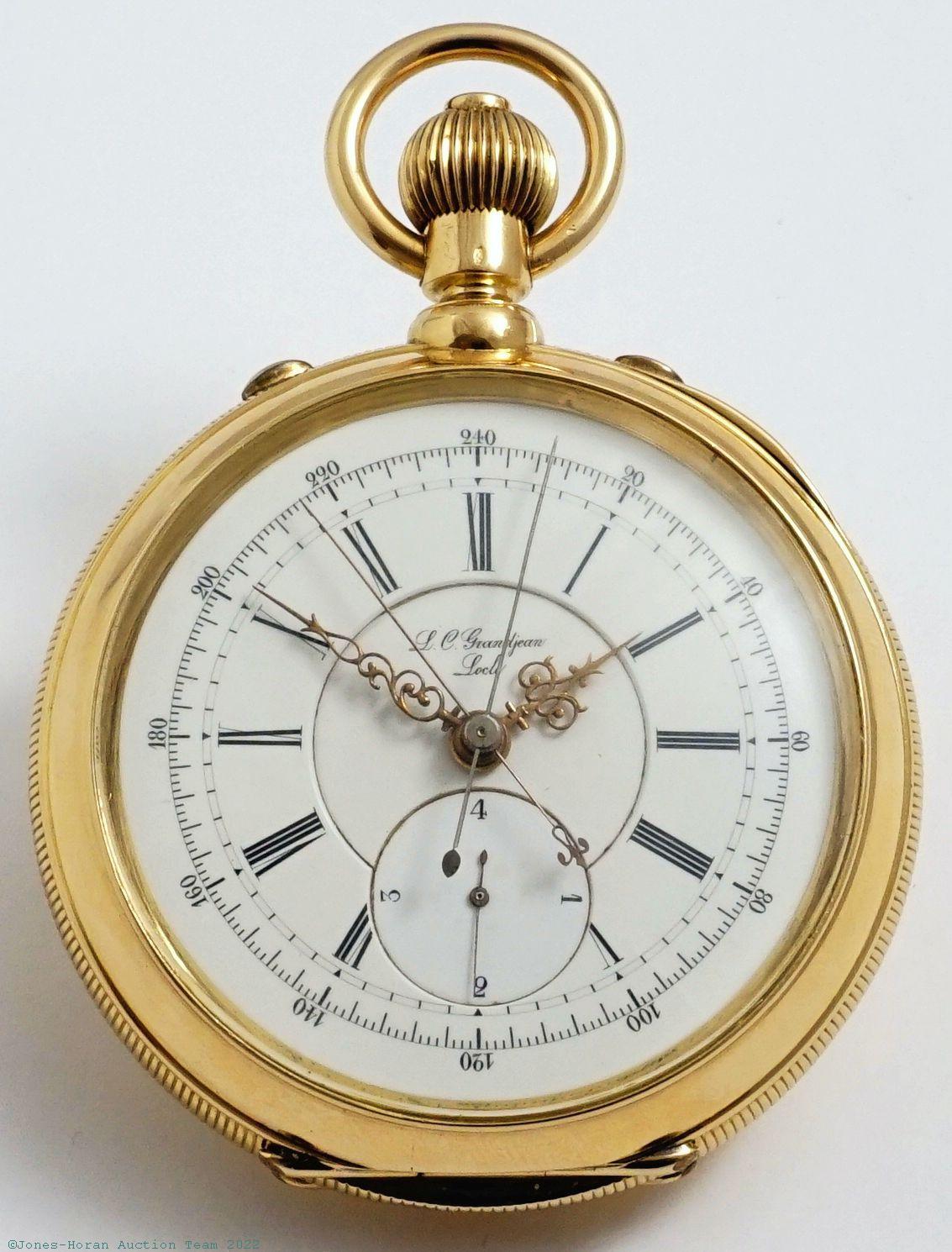 EPW - L.C. Grandjean, Locle, tandem-winding two-train split-seconds chronograph with quarter-second jump, 57mm, heavy 18K gold OF original case with small Jurgensen-style lips, signed gold cuvette, glazed observation cover over mvt, white enamel DS dial, fancy gilt Louis XV style hands, SW-button-set, fully capped lever escapement, likely 31-33J, fausses-côtes pattern nickel damascene, s#4822 within case. Gross weight of assembled watch 99.5 dwt (154.8 g).