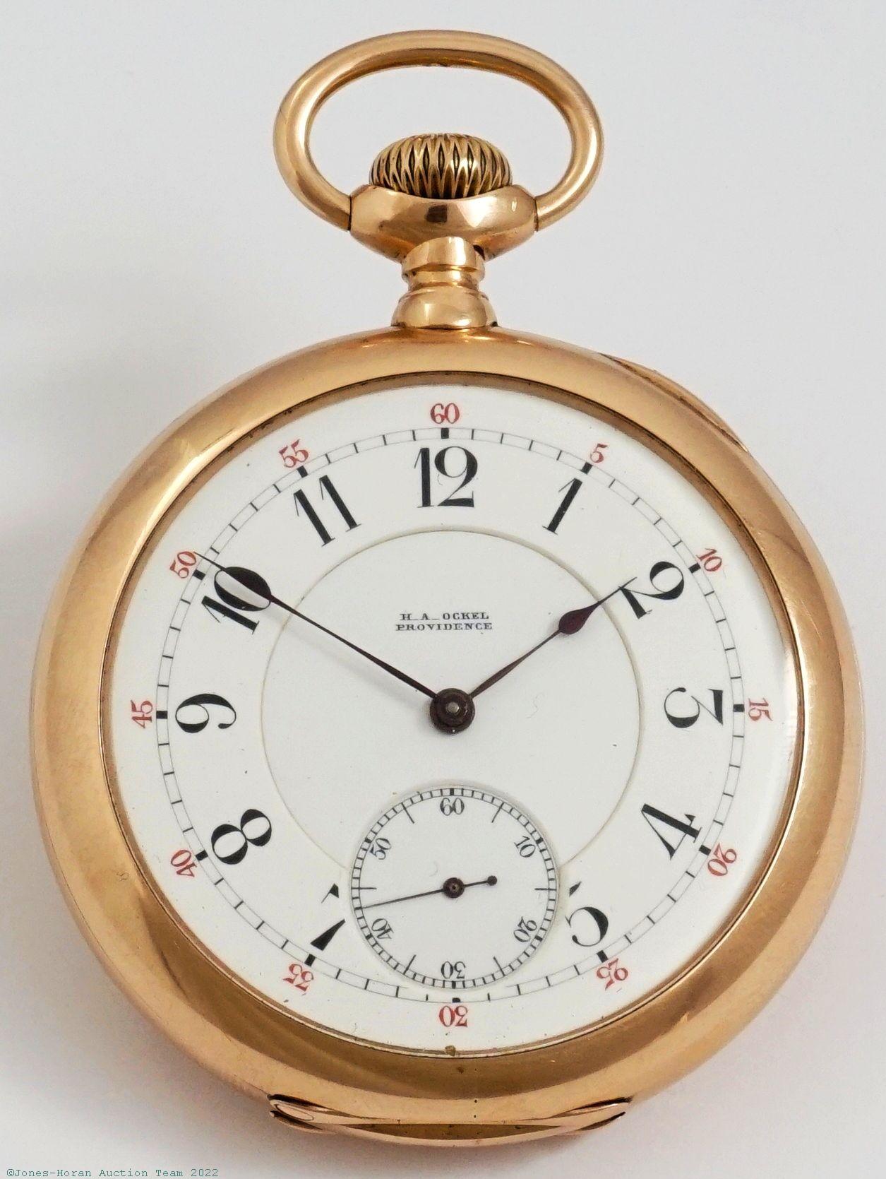 EPW - C.H. Meylan, Brassus (unsigned, our attribution), mvt and dial marked only for retailer Hermann A. Ockel of Providence, Rhode Island, 52mm, heavy 14K rose gold OF original J&S (Jeannot & Shiebler) case with ornate monogram initials to rear, gold cuvette, glazed observation cover over mvt, white enamel DS dial, SW-SS, fully capped lever escapement, 20-21J, wolf's tooth winding, fausses-côtes pattern nickel damascene, s#9168. Gross weight of assembled watch 73.5 dwt (114.3 g). An excellent example throughout.