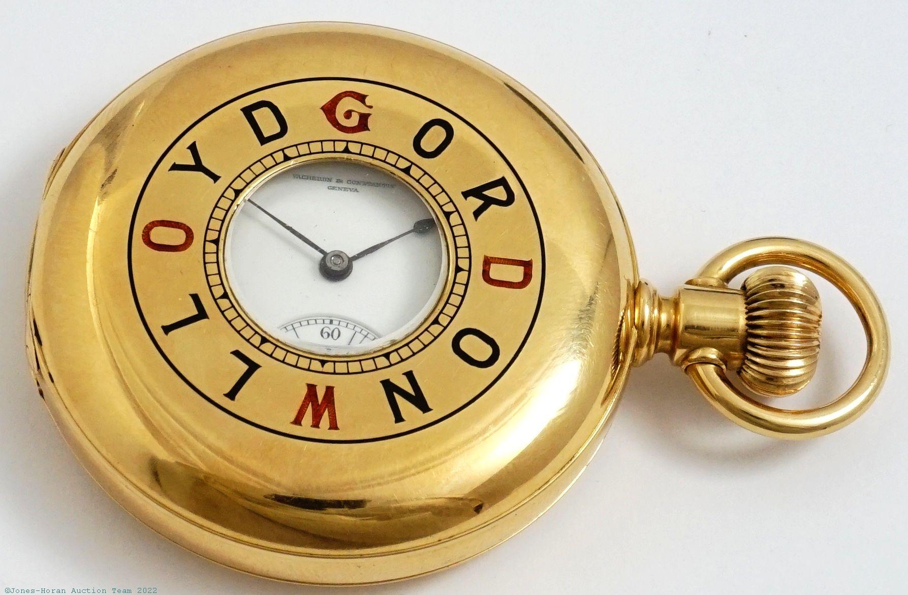 EPW - Vacheron & Constantin, Genève, 50mm, heavy 18K gold original J&S (Jeannot & Shiebler) demi-HC with "Gordon W. Lloyd" in orange and black enamel around front lid aperture, script "L" engraved to rear, gold cuvette, white enamel SS dial with blue 5-minute markings, SW-LS, fully capped lever escapement with mustache counterpoise, 20J, wolf's tooth winding, nickel damascene, s#273174 with matching serial number within case. Gross weight of assembled watch 81.7 dwt (127.1 g). An attractive example with an interesting heavy gold case.