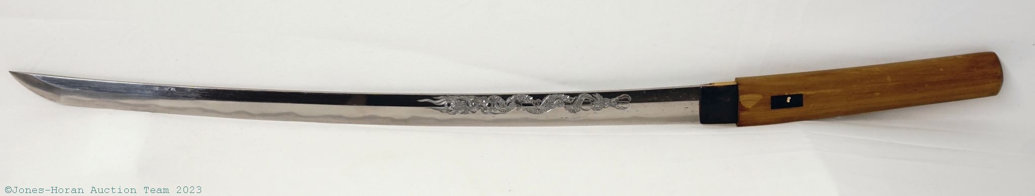 Japanese Shinto Wakizashi, signed nakago "Shinano Kami Monamoto Nobayosh," blade with carved dragon motif, wooden shirasaya with sayagaki, blade measures 20 inches in length and 29 inches in length from tip to nakago, a lovely Japanese Wakizashi sure to delight its new owner.