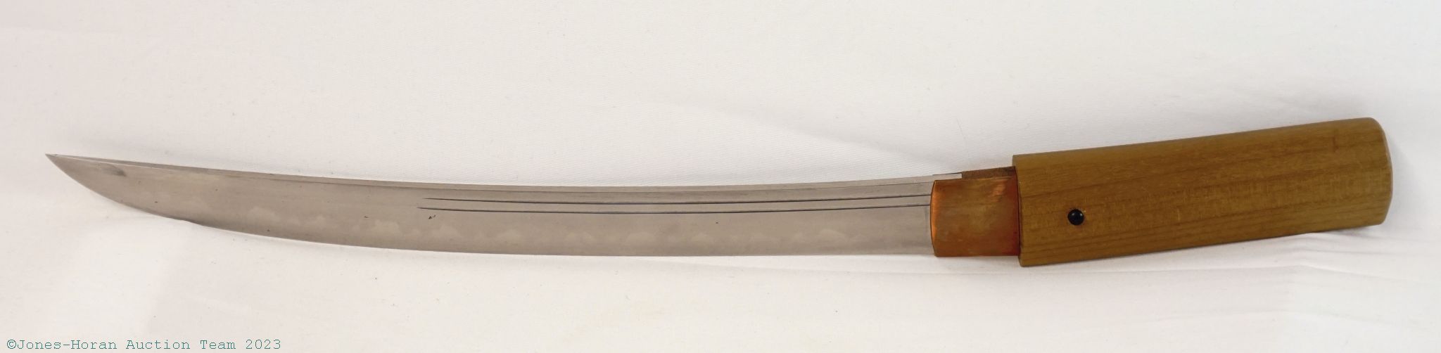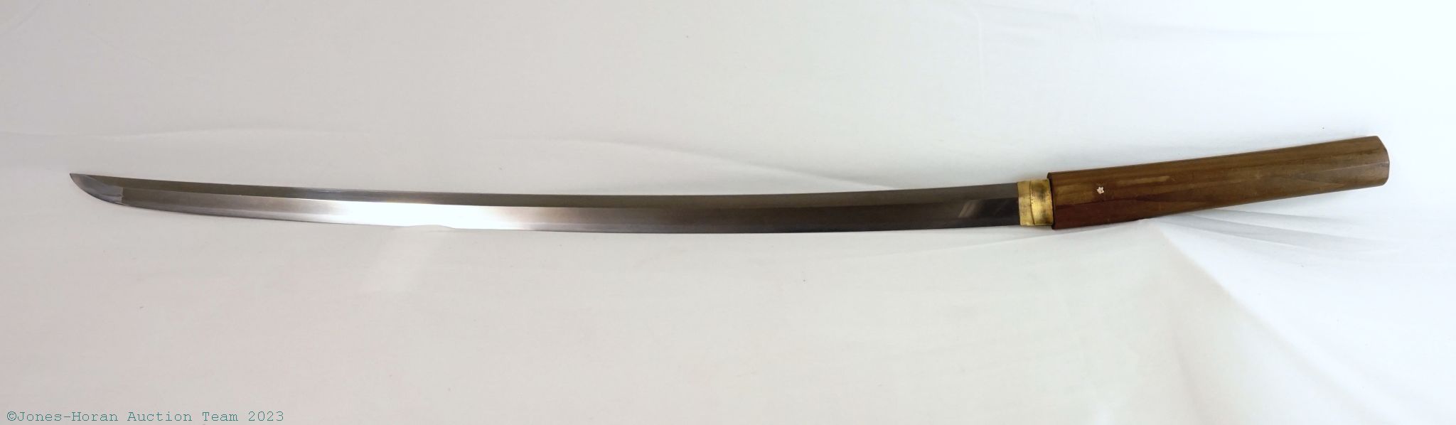 Japanese Shinto Wakizashi, signed nakago, wooden shirasaya with aged yellow tape, blade measures 23.5 inches in length and 29 inches in length from tip to nakago, a lovely signed Japanese Wakizashi sure to delight its new owner.