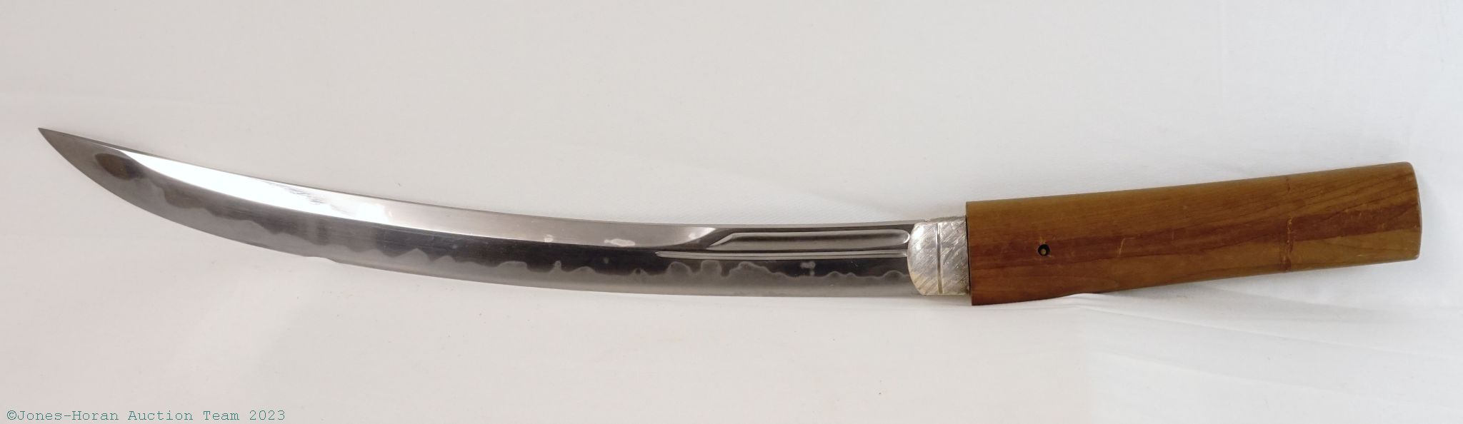 Japanese Soshu Tanto, signed nakago "HIRO-SUNE," hira zukuri blade form, wooden shirasaya with sayagaki, blade measures 13 inches in length and 19.5 inches in length from tip to nakago, a lovely Japanese Soshu Tanto sure to delight its new owner.