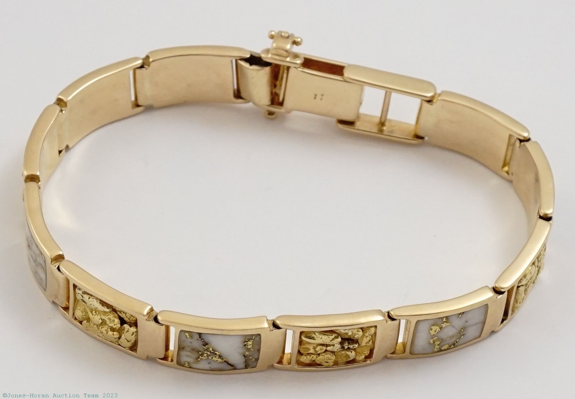 Man's gold nugget, gold quartz and 14K gold bracelet, 6 links inset with multiple small placer nuggets, 5 alternating gold quartz cabochons set into 14K gold links, bracelet measures 7.5 inches on furthest adjustment, truly a fabulous gold bracelet with links you seldom see, for the TRUE lover of gold. Gross weight 27.2 dwt (42.4 g). From the collection of J.D. Unruh.