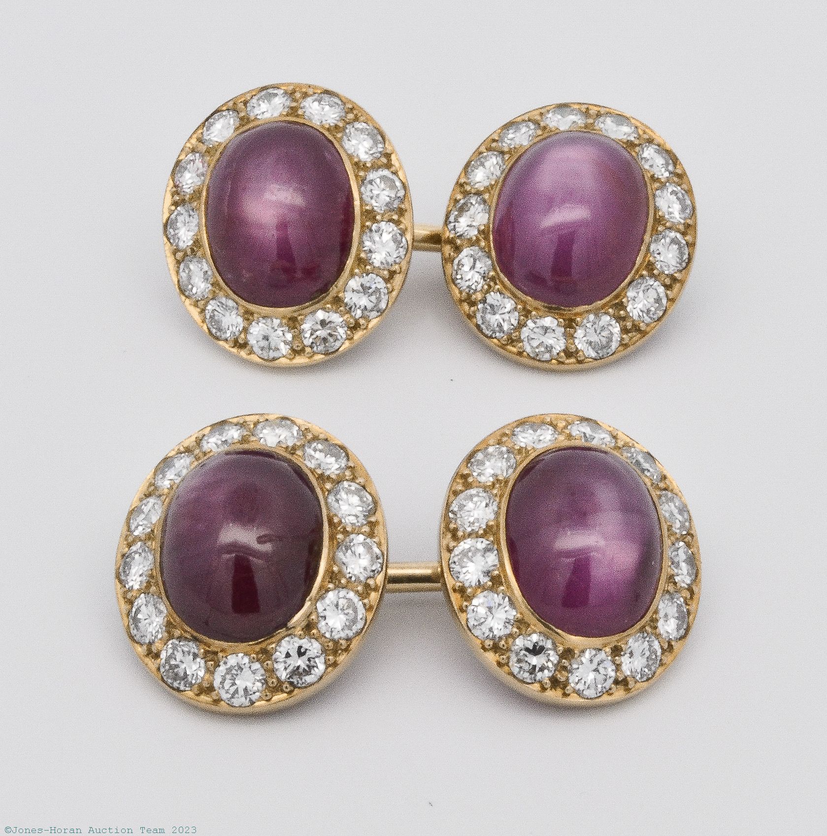 Star ruby, diamond and 18K yellow gold cufflinks, 4 star ruby cabochons set at cufflink centers measure 8mm x 10mm, 52 round brilliant cut diamonds set into the cufflinks weigh approximately 2.6 ctw, F-G color diamonds of SI1 to VS clarity, cufflinks measure 13.7mm x 15.8mm, a fabulous set of cufflinks seldom seen today. Gross weight 8.3 dwt (13.0 g). From the estate of Red Skelton.