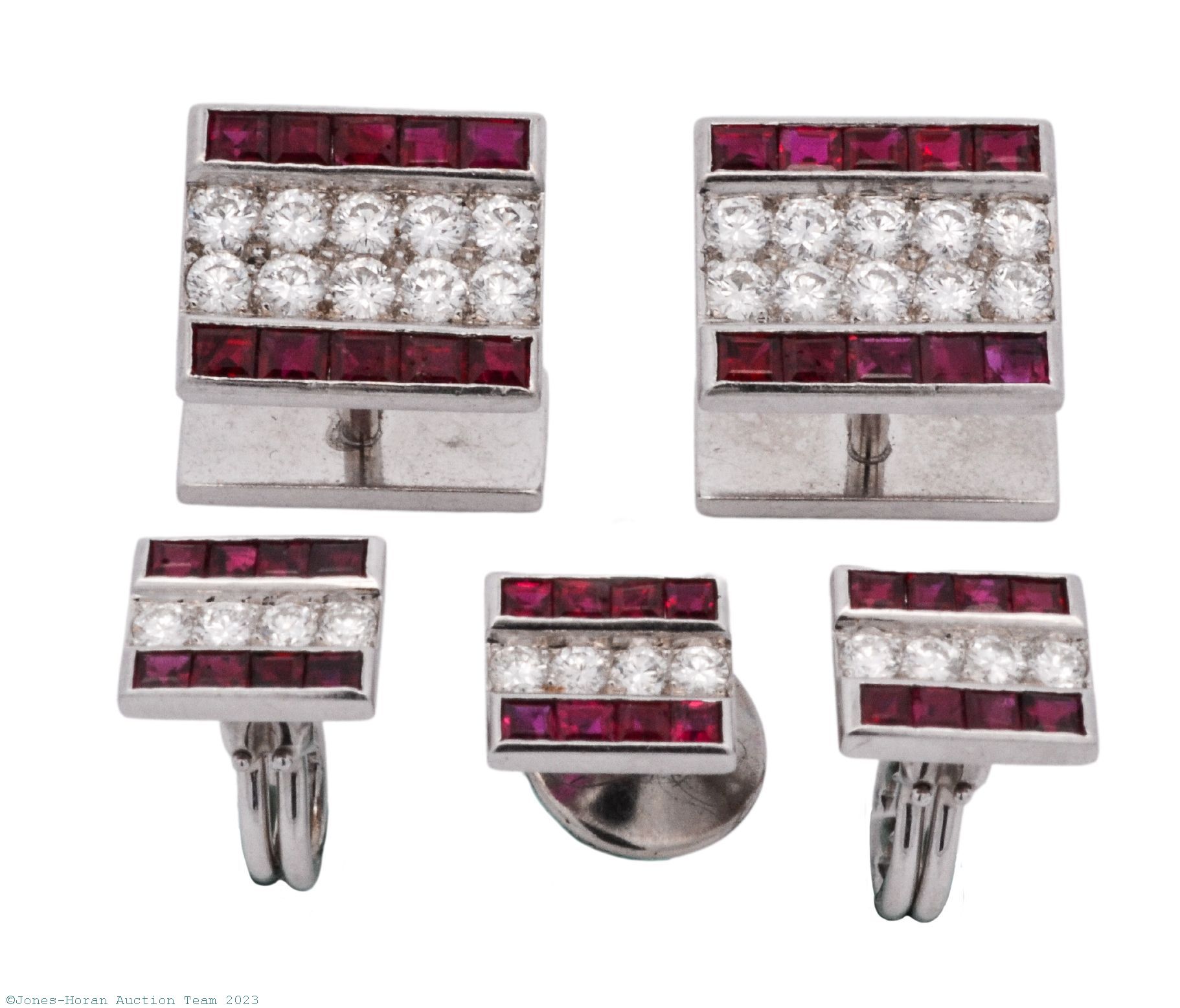 Diamond, ruby & platinum cufflink, dress stud and pin set by Ruser of Beverly Hills, 32 round brilliant cut diamonds weigh approximately 2.48 ctw, diamonds are E to F color and VS clarity or better, 44 square cut rubies weigh approximately 1.80 ctw, cufflinks measure 15.3mm x 13.2mm, shirt stud measures 8.4mm x 10mm, a truly fabulous set sure to delight its new owner. Gross weight of combined platinum pieces 15.7 dwt (24.4 g). From the estate of Red Skelton.