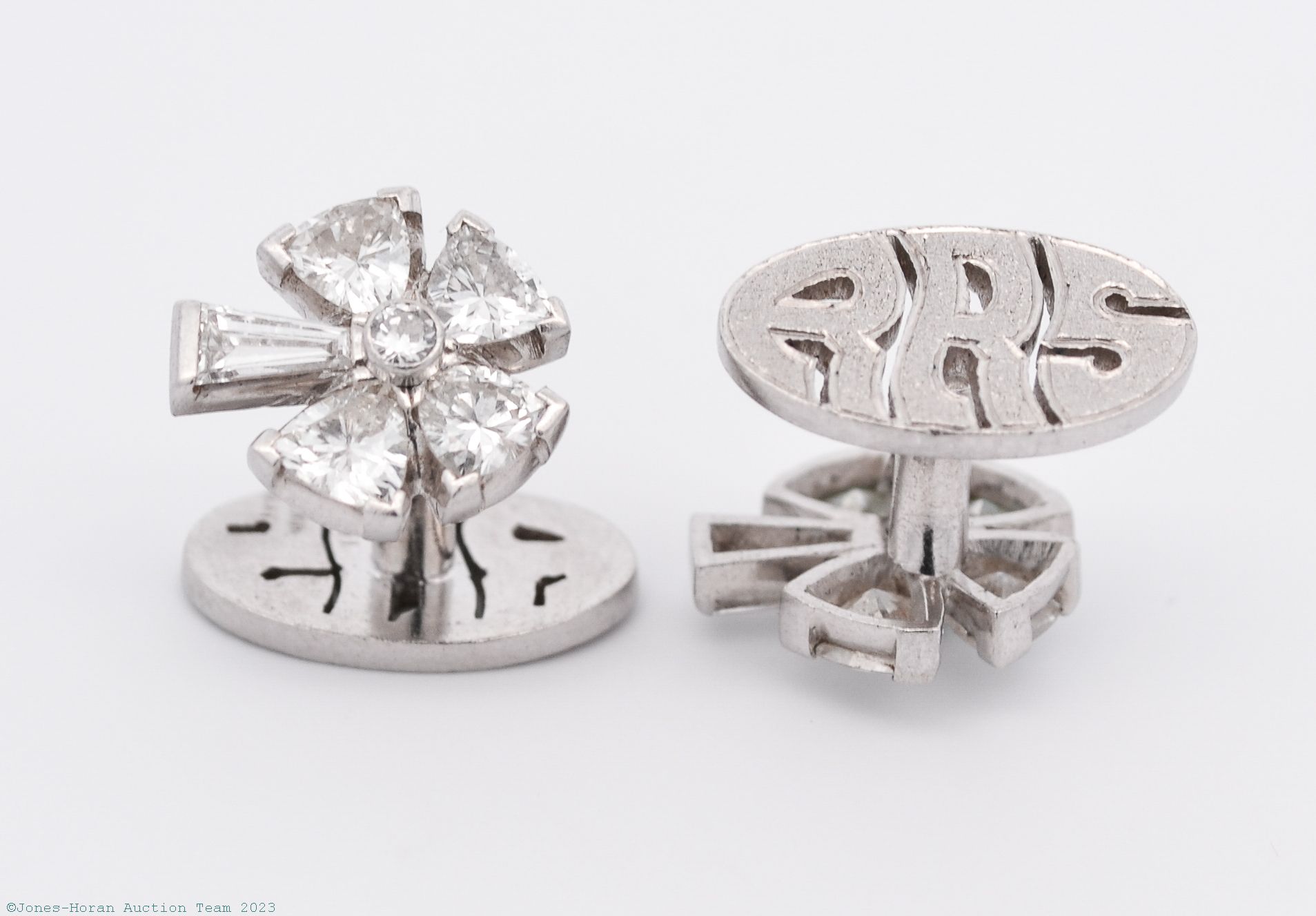 Diamond and platinum shamrock cufflinks by Ruser of Beverly Hills, 8 trillion cut diamonds set into the cufflinks weigh approximately 2.40 ctw, 2 tapored baguette cut diamonds set as the stems of the shamrocks weigh approximately 0.40 ctw, diamonds are E-F color and VS clarity or better, cufflinks measure 13mm x 14mm, rear of cufflinks are pierced and stippled with the letters RRS for Richard Red Skelton, a fabulous pair of platinum cufflinks of exquisite quality sure to delight. Gross weight of cufflinks 10.3 dwt (16.0 g). From the estate of the Red Skelton.
