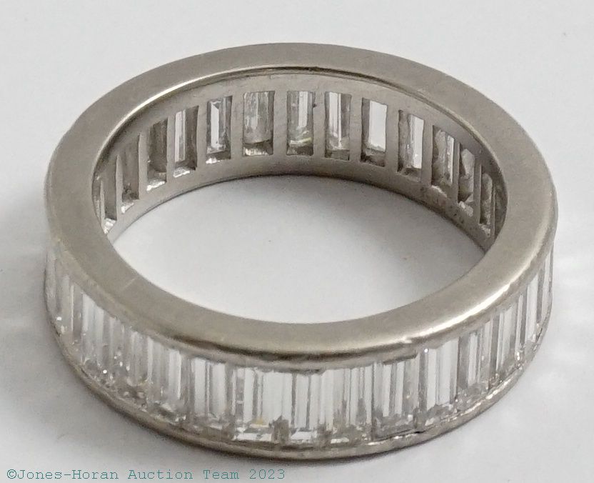 Diamond & platinum eternity band by Ruser of Beverly Hills, 32 straight baguette cut diamonds weigh approximately 5.76 ctw, diamonds are E to F color and VS clarity or better, ring size 11, a most spectacular wedding band the likes of which are seldom seen, this was the personal wedding band of Red Skelton and worn daily for many years. Gross weight 9.5 dwt (14.8 g). From the estate of Red Skelton.